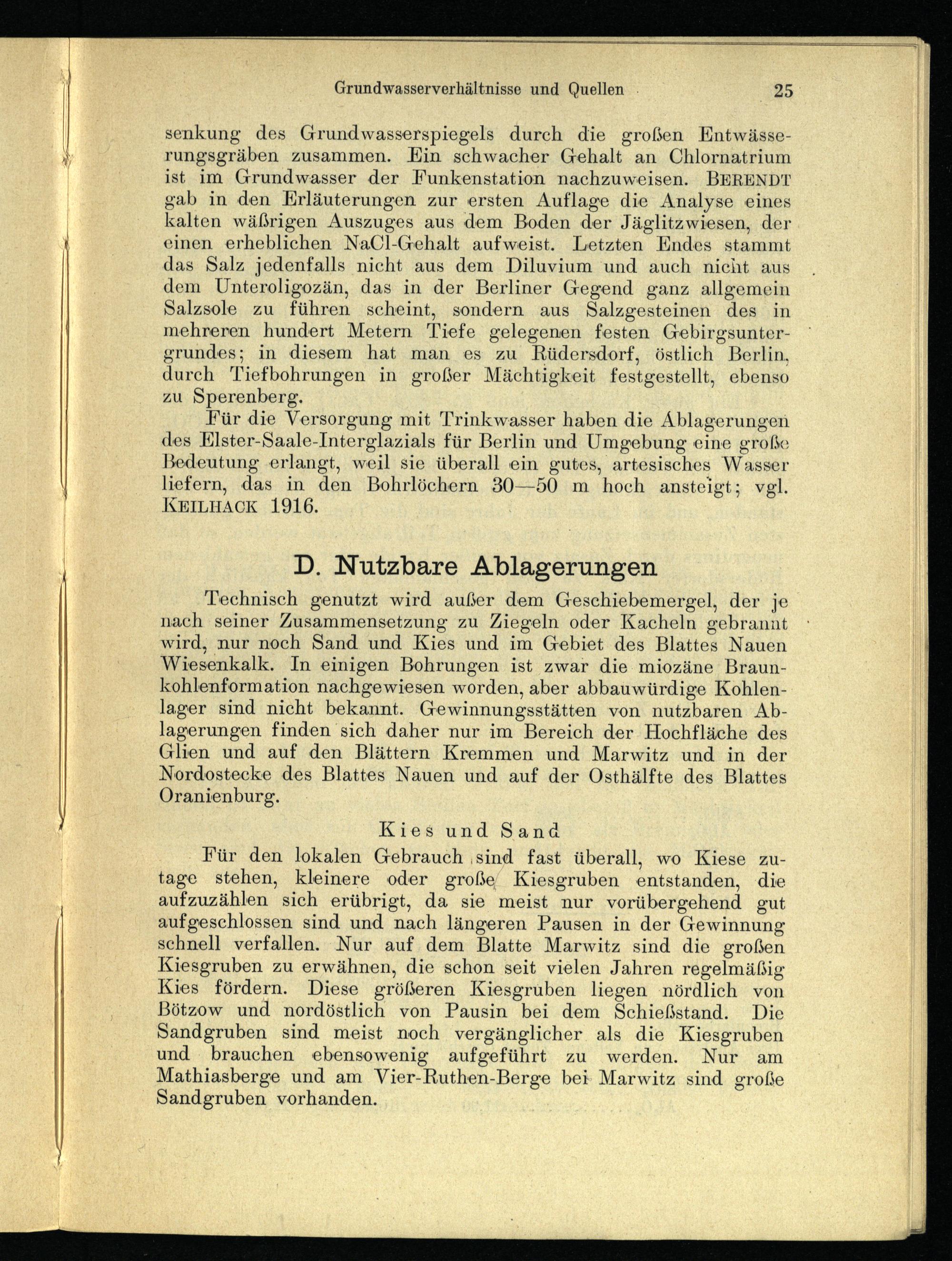 Für den lokalen Gebrauch ‚sind fast überall, wo Kiese zutage stehen, kleinere oder große/ Kiesgruben entstanden, die aufzuzählen sich erübrigt, da sie meist nur vorübergehend gut aufgeschlossen sind und nach längeren Pausen in der Gewinnung schnell verfallen. Nur auf dem Blatte Marwitz sind die großen Kiesgruben zu erwähnen, die schon seit vielen Jahren regelmäßig Kies fördern. Diese größeren Kiesgruben liegen ‚nördlich von Bötzow und nordöstlich von Pausin bei dem Schießstand. Die Sandgruben sind meist noch vergänglicher. als die Kiesgruben und brauchen ebensowenig aufgeführt zu werden. Nur am Mathiasberge und am Vier-Ruthen-Berge bei Marwitz sind große Sandgruben vorhanden.