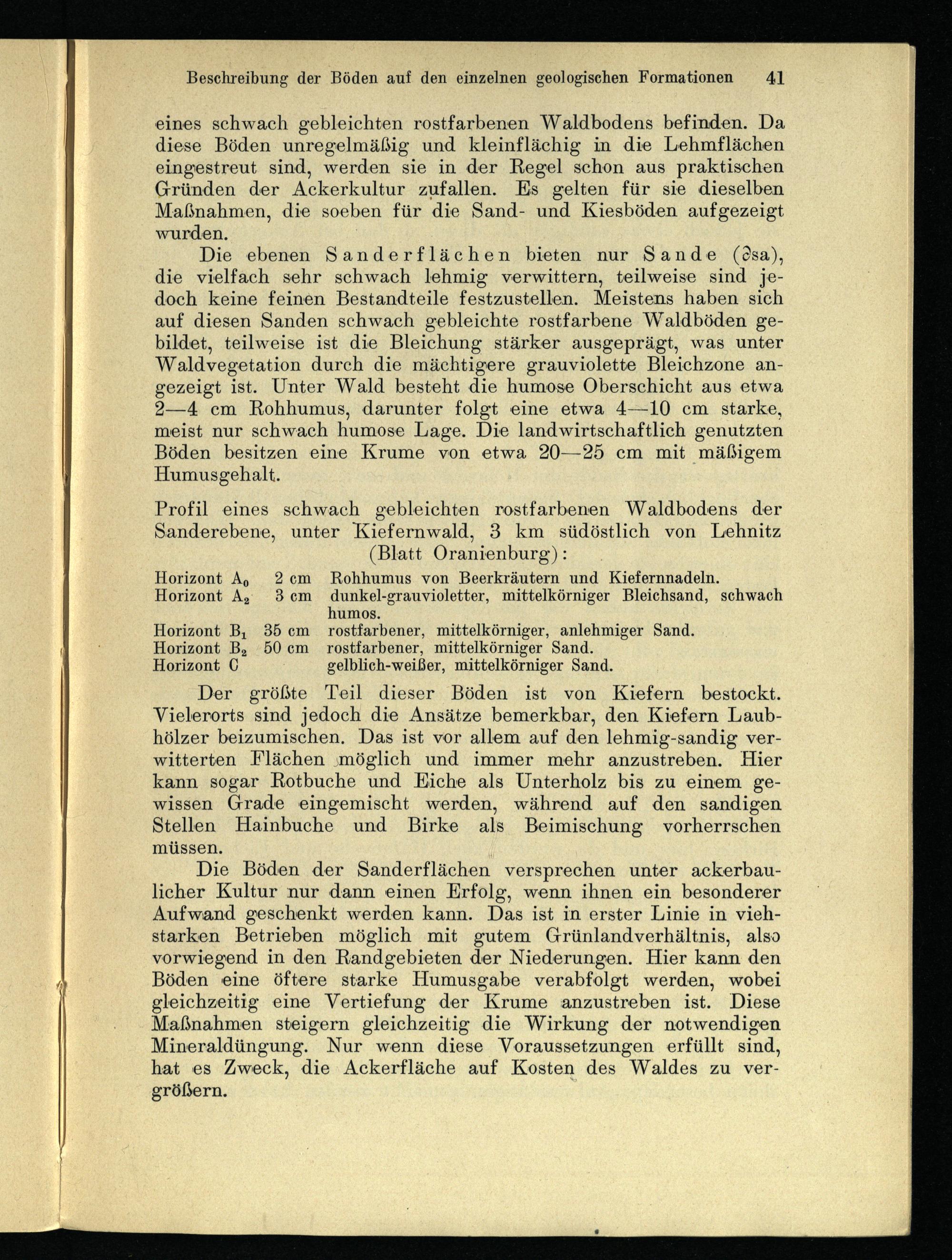 Die ebenen Sanderflächen bieten nur Sande(sa), die vielfach sehr schwach lehmig verwittern, teilweise sind jedoch keine feinen Bestandteile festzustellen. Meistens haben sich auf diesen Sanden schwach gebleichte rostfarbene Waldböden gebildet, teilweise ist die Bleichung stärker ausgeprägt, was unter Waldvegetation durch die mächtigere grauviolette Bleichzone angezeigt ist. Unter Wald besteht die humose Oberschicht aus etwa 2—4 cm Rohhumus, darunter folgt eine etwa 4—10 cm starke, meist nur schwach humose Lage. Die landwirtschaftlich genutzten Böden besitzen eine Krume von etwa 20—25 cm mit mäßigem Humusgehalt.