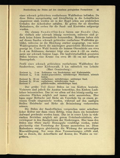 eines schwach gebleichten rostfarbenen Waldbodens befinden. Da diese Böden unregelmäßig und kleinflächig in die Lehmflächen eingestreut sind, werden sie in der Regel schon aus praktischen Gründen der Ackerkultur zufallen. Es gelten für sie dieselben Maßnahmen, die soeben für die Sand- und Kiesböden aufgezeigt wurden.