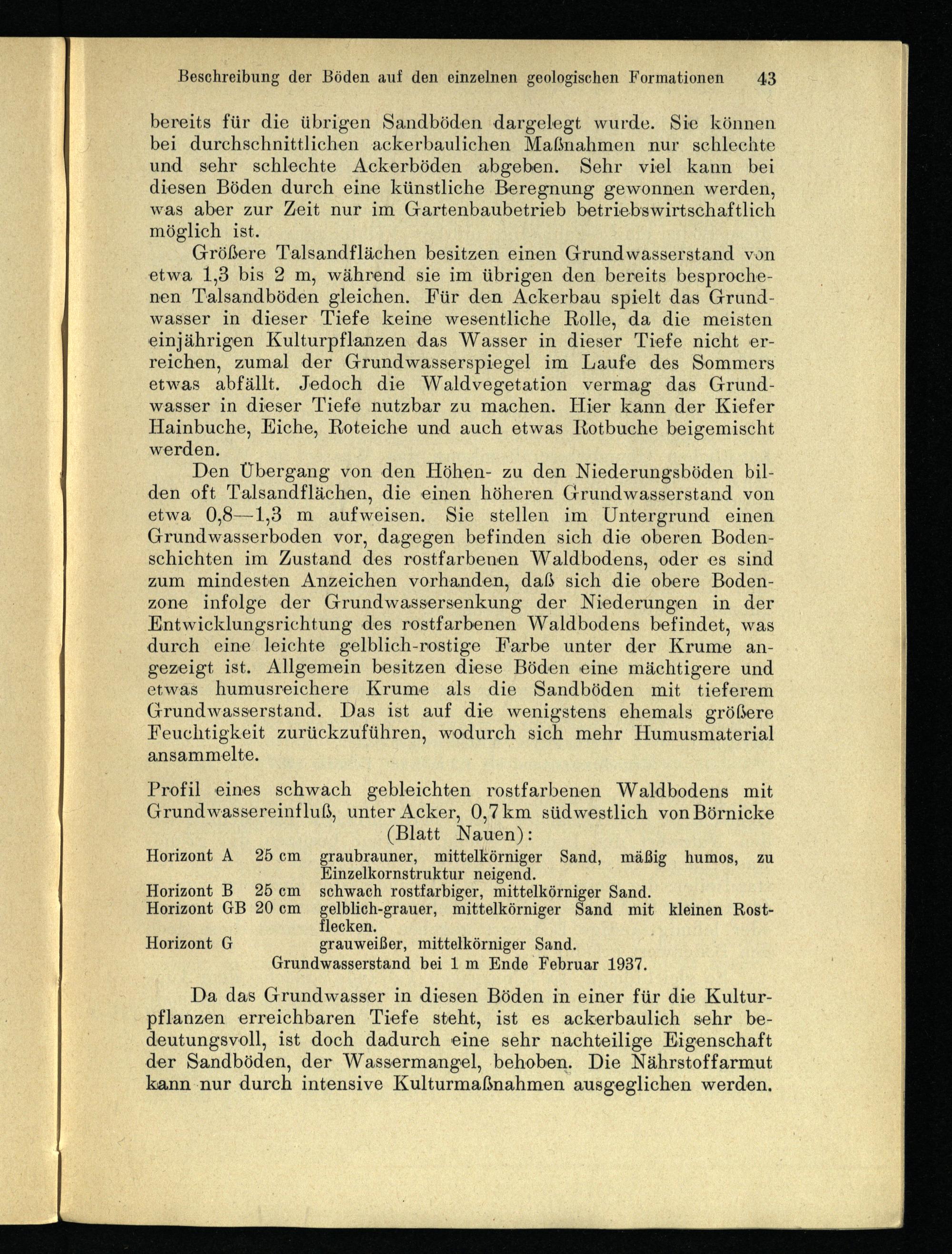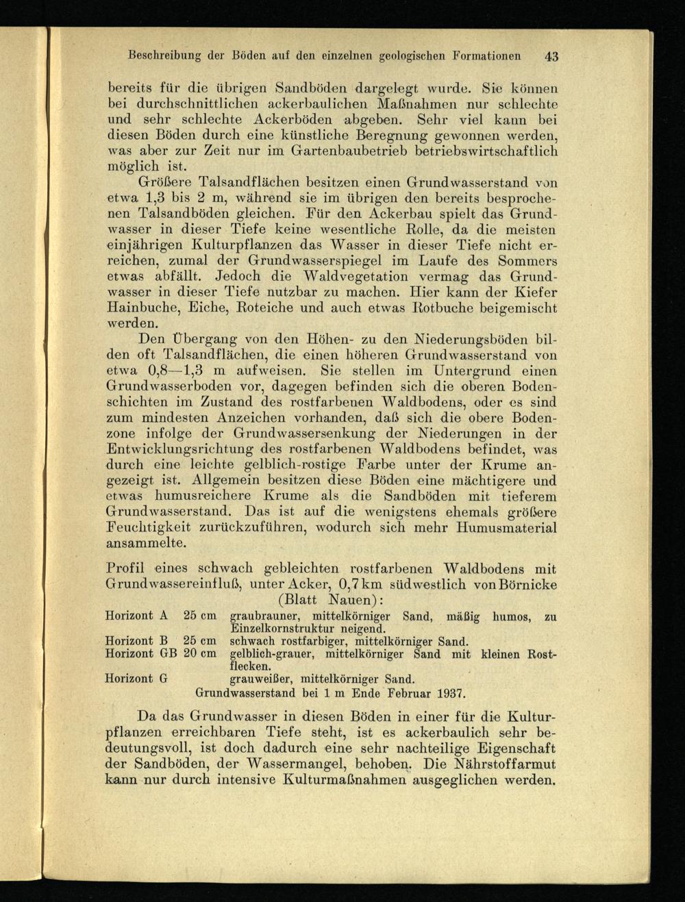 Horizont A 25cm graubrauner, mittelkörniger Sand, mäßig humos, zu Einzelkornstruktur neigend. Horizont B 25cm schwach rostfarbiger, mittelkörniger Sand. Horizont GB 20cm gelblich-grauer, mittelkörniger Sand mit kleinen Rostflecken. Horizont G grauweißer, mittelkörniger Sand. Grundwasserstand bei 1 m Ende Februar 1937.