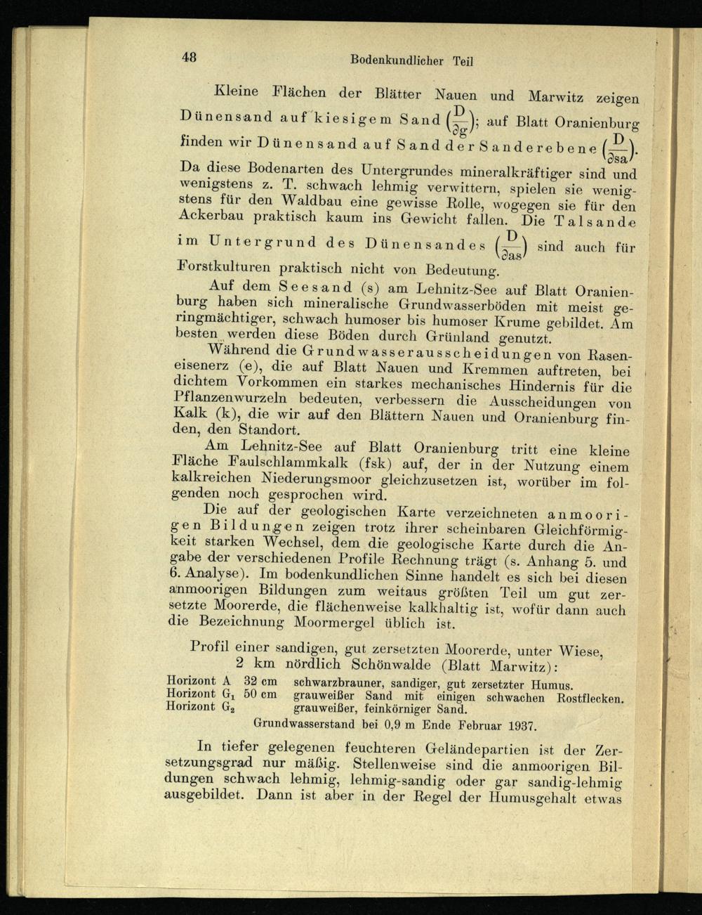 Profil einer sandigen, gut zersetzten Moorerde, unter Wiese, 2 km nördlich Schönwalde(Blatt Marwitz): Horizont A 32cm schwarzbrauner, sandiger, gut zersetzter Humus. Horizont G, 50cm grauweißer Sand mit einigen schwachen Rostflecken. Horizont G, grauweißer, feinkörniger Sand. Grundwasserstand bei 0,9 m Ende Februar 1937.