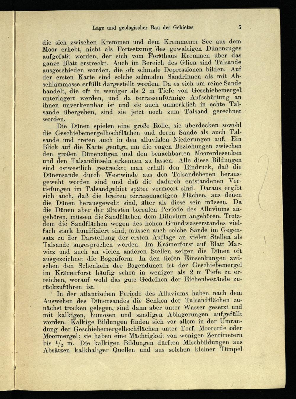 Die Dünen spielen eine große Rolle, sie überdecken sowohl die Greschiebemergelhochflächen und deren Sande als auch Talsande und treten auch in den alluvialen Niederungen auf. Ein Blick auf die Karte genügt, um die engen Beziehungen zwischen den großen Dünenzügen und den benachbarten Moorerdesenken und den Talsandinseln erkennen zu lassen. Alle diese Bildungen sind ostwestlich gestreckt; man erhält den Eindruck, daß die Dünensande durch Westwinde aus den Talsandebenen herausgeweht worden sind und daß die dadurch entstandenen Vertiefungen im Talsandgebiet später vermoort sind. Daraus ergibt sich auch, daß die breiten terrassenartigen Flächen, aus denen die Dünen herausgeweht sind, älter als diese sein müssen. Da die Dünen aber der ältesten borealen Periode des Alluviums angehören, müssen die Sandflächen dem Diluvium angehören. Trotzdem die Sandflächen wegen des hohen Grundwasserstandes vielfach stark humifiziert sind, müssen auch solche Sande im Gegensatz zu der Darstellung der ersten Auflage an vielen Stellen als Talsande angesprochen werden. Im Krämerforst auf Blatt Marwitz und auch an vielen anderen Stellen zeigen die Dünen oft ausgezeichnet die Bogenform. In den tiefen Einsenkungen zwischen den Schenkeln der Bogendünen ist der Geschiebemergel im Krämerforst häufig schon in weniger als 2 m Tiefe zu erreichen, worauf wohl das gute Gedeihen der Eichenbestände zurückzuführen ist.
