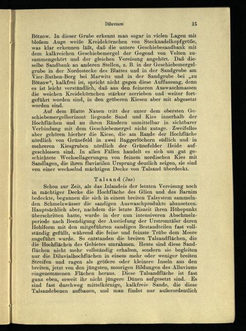 Auf dem Blatte Nauen tritt der unter dem obersten Geschiebemergelhorizont liegende Sand und Kies innerhalb der Hochflächen und an ihren Rändern unmittelbar in sichtbarer Verbindung mit dem Geschiebemergel nicht zutage. Zweifellos aber gehören hierher die Kiese, die am Rande der Hochfläche nördlich von Grünefeld in zwei Baggerlöchern südlich und in mehreren Kiesgruben nördlich der Grünefelder Heide aufgeschlossen sind. In allen Fällen handelt es sich um gut geschichtete Wechsellagerungen von feinem nordischen Kies mit Sandlagen, die ihren fluviatilen Ursprung deutlich zeigen, sie sind von einer wechselnd mächtigen Decke von Talsand überdeckt.