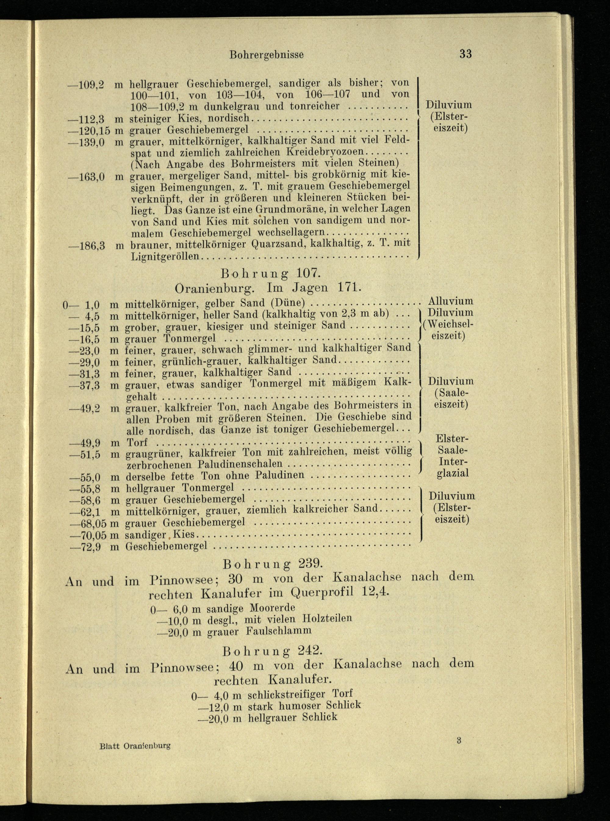 —109,2 m hellgrauer Geschiebemergel, sandiger als bisher; von 100—101, von 1083—104, von 106—107 und von| 108—109,2 m dunkelgrau und tonreicher Diluvium —112,3 m steiniger Kies, nordisch\(Elster—120,15 m grauer Geschiebemergel| eiszeit) —189,0 m grauer, mittelkörniger, kalkhaltiger Sand mit viel Feldspat und ziemlich zahlreichen Kreidebryozoen (Nach Angabe des Bohrmeisters mit vielen Steinen) —163,0 m grauer, mergeliger Sand, mittel- bis grobkörnig mit kiesigen Beimengungen, z. T. mit grauem Geschiebemergel verknüpft, der in größeren und kleineren Stücken beiliegt. Das Ganze ist eine Grundmoräne, in welcher Lagen von Sand und Kies mit solchen von sandigem und normalem Geschiebemergel wechsellagern —186,3 m brauner, mittelkörniger Quarzsand, kalkhaltig, z. TV. mit Lignitgeröllen...... 1.20 ern HAG