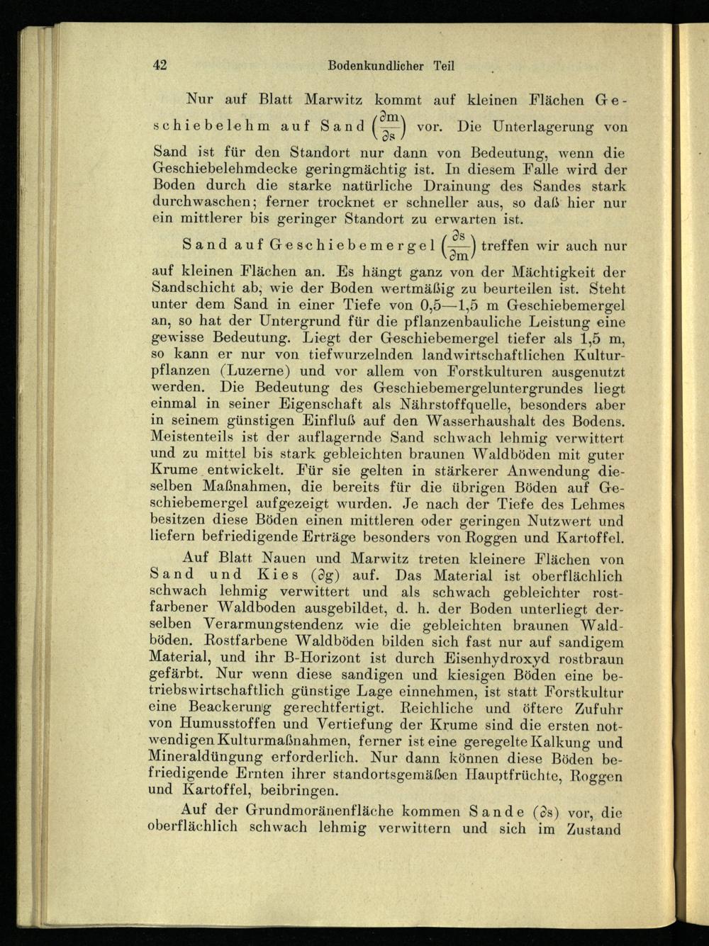 Auf Blatt Nauen und Marwitz treten kleinere Flächen von Sand und Kies(%g) auf. Das Material ist oberflächlich schwach lehmig verwittert und als schwach gebleichter rostfarbener Waldboden ausgebildet, d. h. der Boden unterliegt derselben Verarmungstendenz wie die gebleichten braunen Waldböden. Rostfarbene Waldböden bilden sich fast nur auf sandigem Material, und ihr B-Horizont ist durch Eisenhydroxyd rostbraun gefärbt. Nur wenn diese sandigen und kiesigen Böden eine betriebswirtschaftlich günstige Lage einnehmen, ist statt Forstkultur eine Beackerung gerechtfertigt. Reichliche und öftere Zufuhr von Humusstoffen und Vertiefung der Krume sind die ersten notwendigen Kulturmaßnahmen, ferner ist eine geregelte Kalkung und Mineraldüngung erforderlich. Nur dann können diese Böden befriedigende Ernten ihrer standortsgemäßen Hauptfrüchte, Roggen und Kartoffel, beibringen.