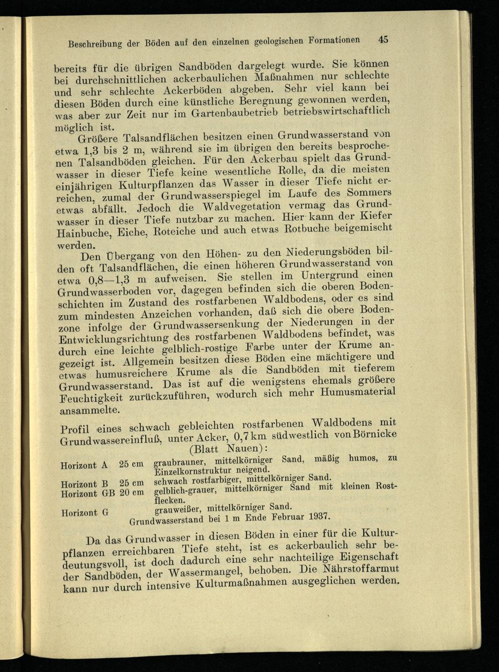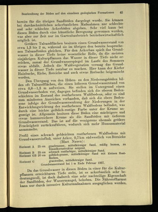 Horizont A 25cm graubrauner, mittelkörniger Sand, mäßig humos, zu Einzelkornstruktur neigend. Horizont B_ 25cm schwach rostfarbiger, mittelkörniger Sand. Horizont GB 20 cm gelblich-grauer, mittelkörniger Sand mit kleinen Rostflecken. Horizont G grauweißer, mittelkörniger Sand. Grundwasserstand bei 1m Ende Februar 1937.