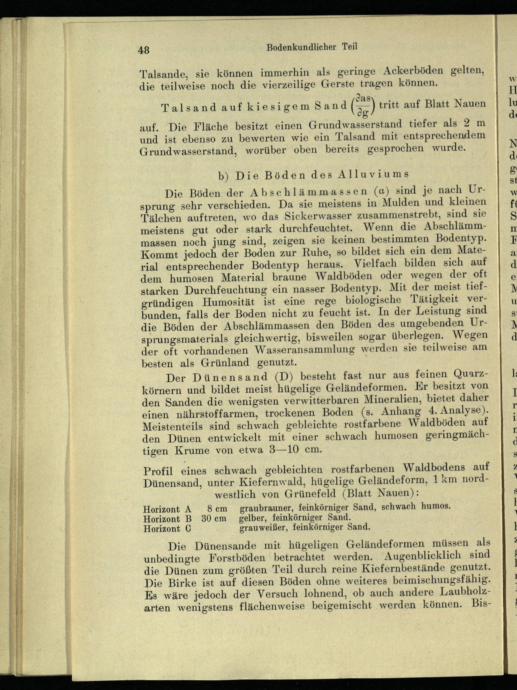 Die Dünensande mit hügeligen Geländeformen müssen als unbedingte Forstböden betrachtet werden. Augenblicklich sind die Dünen zum größten Teil durch reine Kiefernbestände genutzt. Die Birke ist auf diesen Böden ohne weiteres beimischungsfähig. Es wäre jedoch der Versuch lohnend, ob auch andere Laubholzarten wenigstens flächenweise beigemischt werden können, Bis