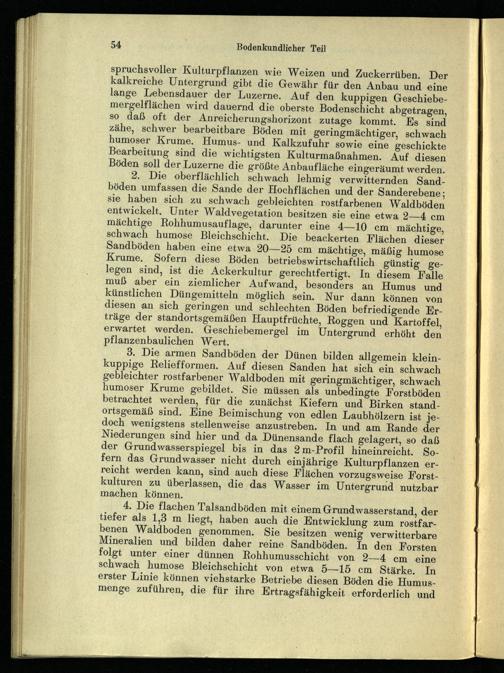 3. Die armen Sandböden der Dünen bilden allgemein kleinkuppige Reliefformen. Auf diesen Sanden hat sich ein schwach gebleichter rostfarbener Waldboden mit geringmächtiger, schwach humoser Krume gebildet. Sie müssen als unbedingte Forstböden betrachtet werden, für die zunächst Kiefern und Birken standortsgemäß sind. Eine Beimischung von edlen Laubhölzern ist jedoch wenigstens stellenweise anzustreben. In und am Rande der Niederungen. sind hier und da Dünensande flach gelagert, so daß der Grundwasserspiegel bis in das 2m-Profil hineinreicht. Sofern das Grundwasser nicht durch einjährige Kulturpflanzen erreicht werden kann, sind auch diese Flächen vorzugsweise Forstkulturen zu überlassen, die das Wasser im Untergrund nutzbar machen können.