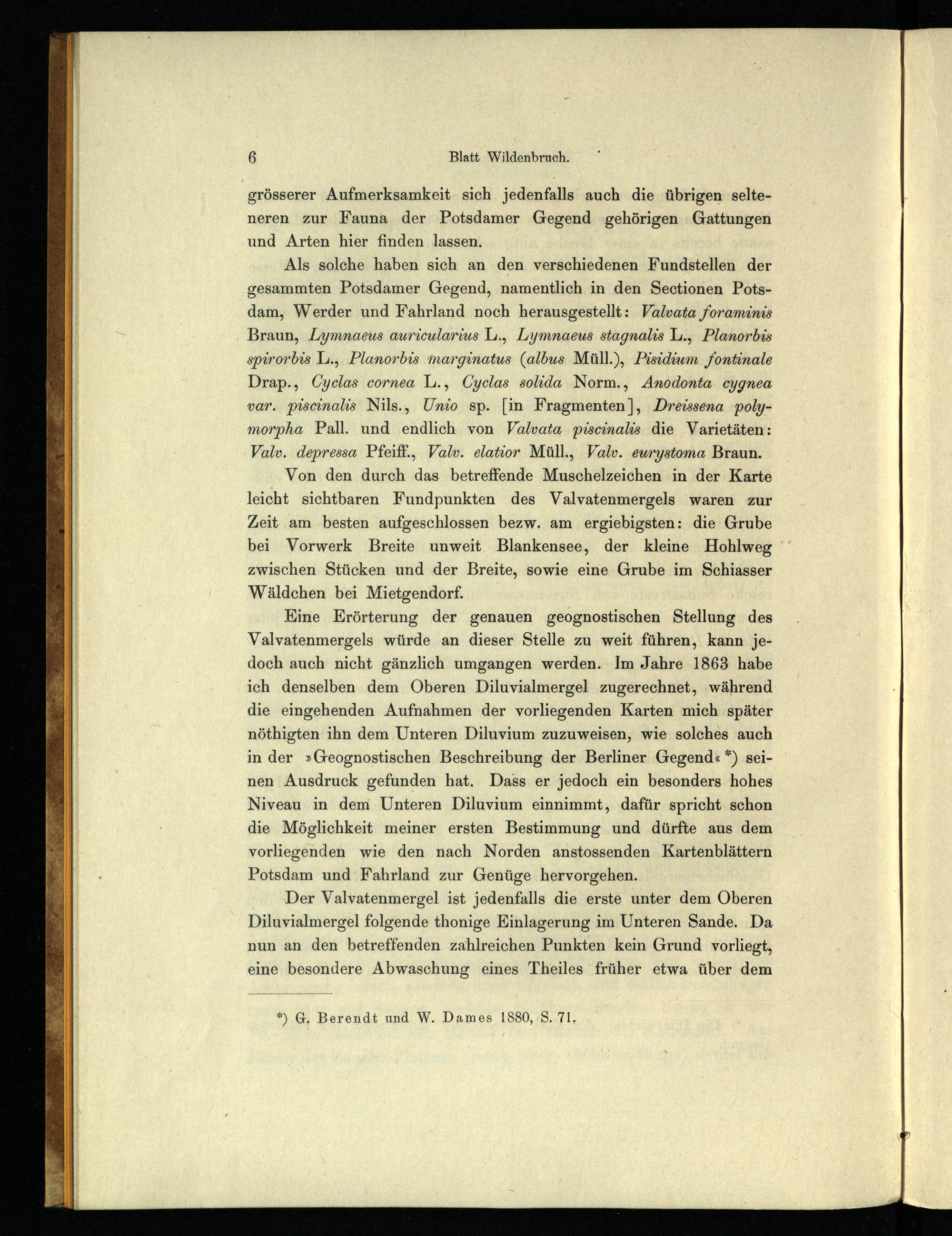 Eine Erörterung der genauen geognostischen Stellung des Valvatenmergels würde an dieser Stelle zu weit führen, kann jedoch auch nicht gänzlich umgangen werden. Im Jahre 1863 habe ich denselben dem Oberen Diluvialmergel zugerechnet, während die eingehenden Aufnahmen der vorliegenden Karten mich später nöthigten ihn dem Unteren Diluvium zuzuweisen, wie solches auch in der»Geognostischen Beschreibung der Berliner Gegend«*) seinen Ausdruck gefunden hat. Dass er jedoch ein besonders hohes Niveau in dem Unteren Diluvium einnimmt, dafür spricht schon die Möglichkeit meiner ersten Bestimmung und dürfte aus dem vorliegenden wie den nach Norden anstossenden Kartenblättern Potsdam und Fahrland zur Genüge hervorgehen.