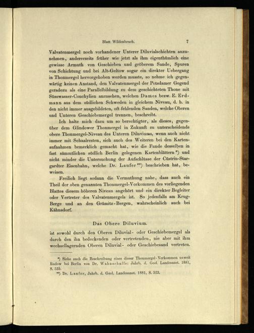 Ich halte mich dazu um so berechtigter, als dieses, gegenüber dem Glindower Thonmergel in Zukunft zu unterscheidende ‚obere Thonmergel-Niveau des Unteren Diluviums, wenn auch nicht immer mit Schaalresten, sich auch des Weiteren bei den Kartenaufnahmen bemerklich gemacht hat, wie die Funde desselben in fast sämmtlichen südlich Berlin gelegenen Kartenblättern*) und nicht minder die Untersuchung der Aufschlüsse der Cüstrin-Stargardter Eisenbahn, welche Dr. Laufer**) beschrieben hat, beweisen.