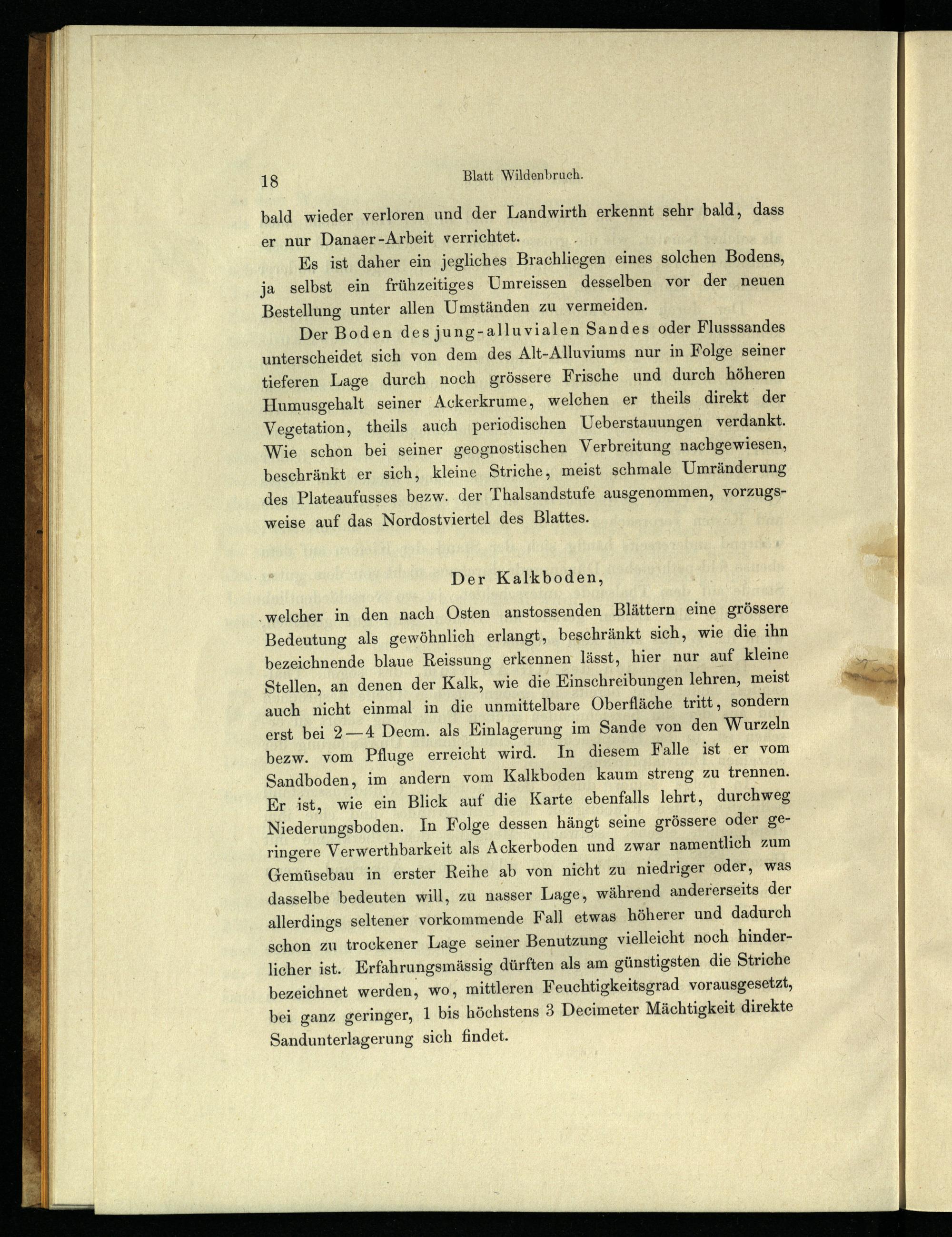 ‚welcher in den nach Osten anstossenden Blättern eine grössere Bedeutung als gewöhnlich erlangt, beschränkt sich, wie die ihn bezeichnende blaue Reissung erkennen lässt, hier nur auf kleine Stellen, an denen der Kalk, wie die Einschreibungen lehren, meist auch nicht einmal in die unmittelbare Oberfläche tritt, sondern erst bei 2—4 Decm. als Einlagerung im Sande von den Wurzeln bezw. vom Pfluge erreicht wird. In diesem Falle ist er vom Sandboden, im andern vom Kalkboden kaum streng zu trennen. Er ist, wie ein Blick auf die Karte ebenfalls lehrt, durchweg Niederungsboden. In Folge dessen hängt seine grössere oder geringere Verwerthbarkeit als Ackerboden und zwar namentlich zum Gemüsebau in erster Reihe ab von nicht zu niedriger oder, was dasselbe bedeuten will, zu nasser Lage, während andererseits der allerdings seltener vorkommende Fall etwas höherer und dadurch schon zu trockener Lage seiner Benutzung vielleicht noch hinderlicher ist. Erfahrungsmässig dürften als am günstigsten die Striche bezeichnet werden, wo, mittleren Feuchtigkeitsgrad vorausgesetzt, bei ganz geringer, 1 bis höchstens 3 Deeimeter Mächtigkeit direkte