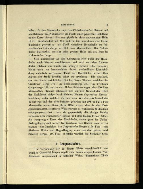 Sich unmittelbar an den Christinendorfer Theil der Hochfläche nach Westen anschliessend und auch von dem Löwendorfer Plateau nur durch ein weniger breites Thal getrennt, bleibt noch ein hauptsächlich durch nordsüdliche Rinnenbildung mehrfach zerrissener Theil der Hochfläche in der Umgegend der Stadt Trebbin selbst zu erwähnen. Die einzelnen, aus der Karte ersichtlichen Stücke dieses Theiles erreichen im Cliestower Berge 175, im Bohldammberge 180, im Trebbiner Galgenberge 198 und in den Hohen Stücken sogar über 200 Fuss Meereshöhe. Ebenso schliessen sich an den Nuhnsdorfer Theil der Hochfläche einige durch kleinere Rinnen abgerissene Plateauinselchen, unter welchen die aus dem Wendisch-Wilmersdorfer Weinberge und der alten Schanze gebildete mit 198 und 241 Fuss Meereshöhe eben dieser ihrer Höhe wegen dem in der Karte gewissermaassen sichtbaren Wasserstrome so wirksamen Widerstand entgegengesetzt hat, dass sie gegenwärtig die einzige Brücke zwischen dem Nuhnsdorfer Plateau und dem Hohen Teltow bildet. Als versprengte Reste der Hochfläche, schon ganz im Nuthethale gelegen, sind in der Nordwestecke des Blattes noch zu erwähnen: das Inselchen des Jütgendorfer Berges(196 Fuss), des Siethener Wein- und Hage-Berges, sowie das des Spitzen und Schiefen Berges(190 Fuss) ebenfalls westlich des Siethener Sees.