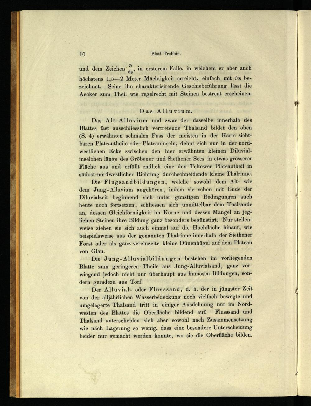 Das Alt-Alluvium und zwar der dasselbe innerhalb des Blattes fast ausschliesslich vertretende Thalsand bildet den oben (S. 4) erwähnten schmalen Fuss der meisten in der Karte sichtbaren Plateautheile oder Plateauinseln, dehnt sich nur in der nordwestlichen Ecke zwischen den hier erwähnten kleinen Diluvialinselchen längs des Gröbener und Siethener Sees in etwas grösserer Fläche aus und erfüllt endlich eine den Teltower Plateautheil in südost-nordwestlicher Richtung durchschneidende kleine Thalrinne.
