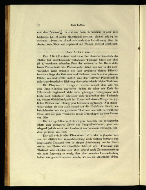 Die Flugsandbildungen, welche sowohl dem Alt- wie dem Jung- Alluvium angehören, indem sie schon mit Ende der Diluvialzeit beginnend sich unter günstigen Bedingungen auch heute noch fortsetzen, schliessen sich unmittelbar dem Thalsande an, dessen Gleichförmigkeit im Korne und dessen Mangel an jeglichen Steinen ihre Bildung ganz besonders begünstigt. Nur stellenweise ziehen sie sich auch einmal auf die Hochfläche hinauf, wie beispielsweise aus der genannten Thalrinne innerhalb der Siethener Forst oder als ganz vereinzelte kleine Dünenhügel auf dem Plateau von Glau.;