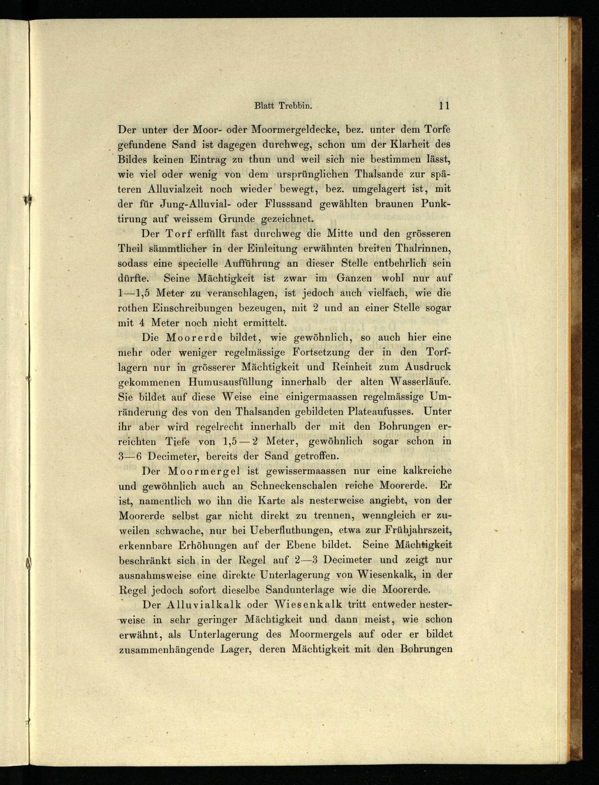Der unter der Moor- oder Moormergeldecke, bez. unter dem Torfe _ gefundene Sand’ ist dagegen durchweg, schon um der Klarheit des Bildes keinen Eintrag zu thun und weil sich nie bestimmen lässt, wie viel oder wenig von dem ursprünglichen Thalsande zur späteren Alluvialzeit noch wieder‘ bewegt, bez. umgelagert ist, mit der für Jung-Alluvial- oder Flusssand gewählten braunen Punktirung auf weissem Grunde gezeichnet.