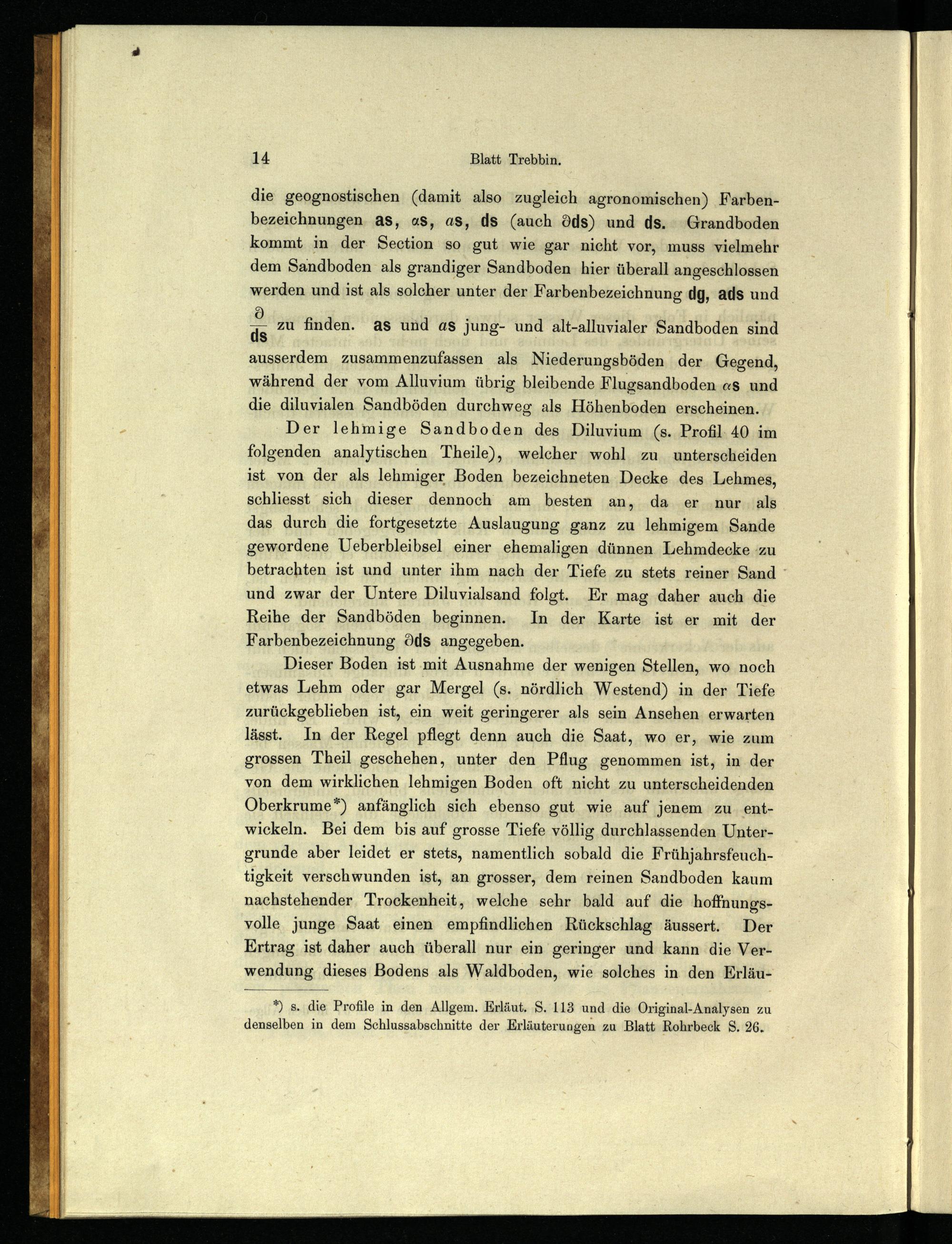 Der lehmige Sandboden des Diluvium(s. Profil. 40 im folgenden analytischen Theile), welcher wohl zu unterscheiden ist von der als lehmiger Boden bezeichneten Decke des Lehmes, schliesst sich dieser dennoch am besten an, da er nur als das durch die fortgesetzte Auslaugung ganz zu lehmigem Sande gewordene Ueberbleibsel einer ehemaligen dünnen Lehmdecke zu betrachten ist und unter ihm nach der Tiefe zu stets reiner Sand und zwar der Untere Diluvialsand folgt. Er mag daher auch die Reihe der Sandböden beginnen. In der Karte ist er mit der Farbenbezeichnung dds angegeben.