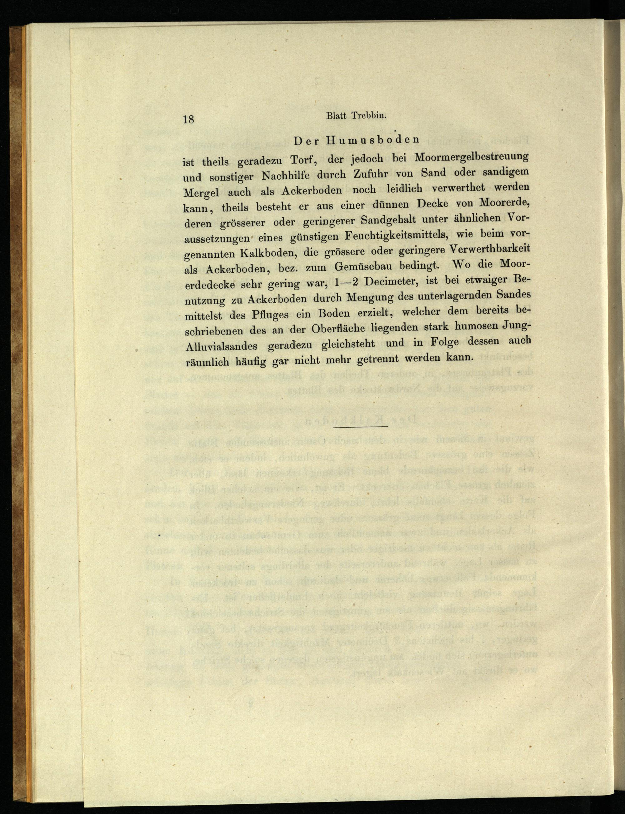 aussetzungen‘ eines günstigen Feuchtigkeitsmittels, wie beim vorgenannten Kalkboden, die grössere oder geringere Verwerthbarkeit als Ackerboden, bez. zum Gemüsebau bedingt. Wo die Moorerdedecke sehr gering war, 1—2 Decimeter, ist bei etwaiger Benutzung zu Ackerboden durch Mengung des unterlagernden Sandes - mittelst des Pfluges ein Boden erzielt, welcher dem bereits beschriebenen des an der Oberfläche liegenden stark humosen JungAlluvialsandes geradezu gleichsteht und in Folge dessen auch räumlich häufig gar nicht mehr getrennt werden kann.