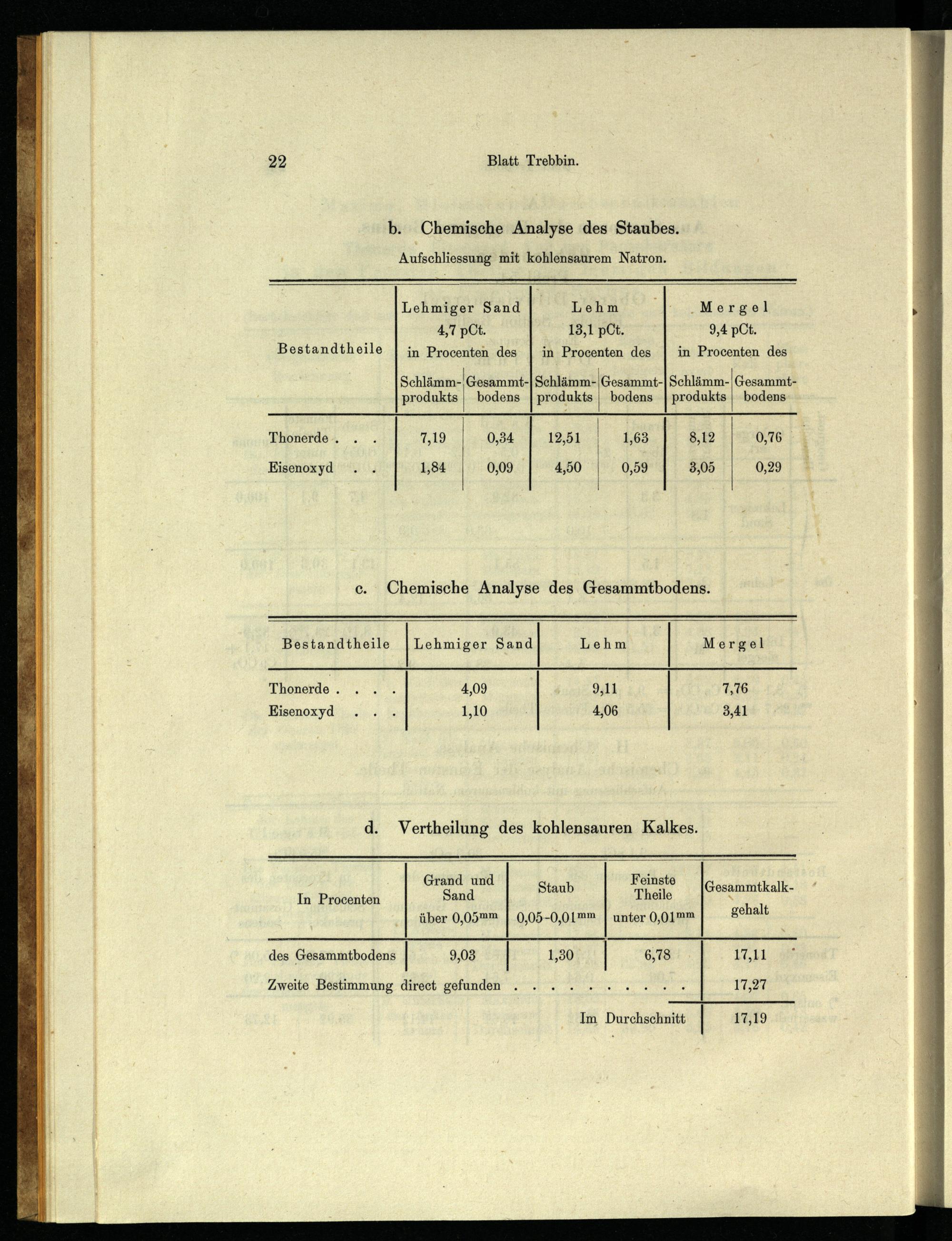Lehmiger Sand Lehm 1.Mergel 4,7 pCt. 13,1 pCt. 9,4 pCt. Bestandtheile|;n Procenten des| in Procenten des| in Procenten des Schlämm-| Gesammt-| Schlämm-| Gesammt-|Schlämm- Gesammtprodukts| bodens| produkts| bodens| produkts| bodens