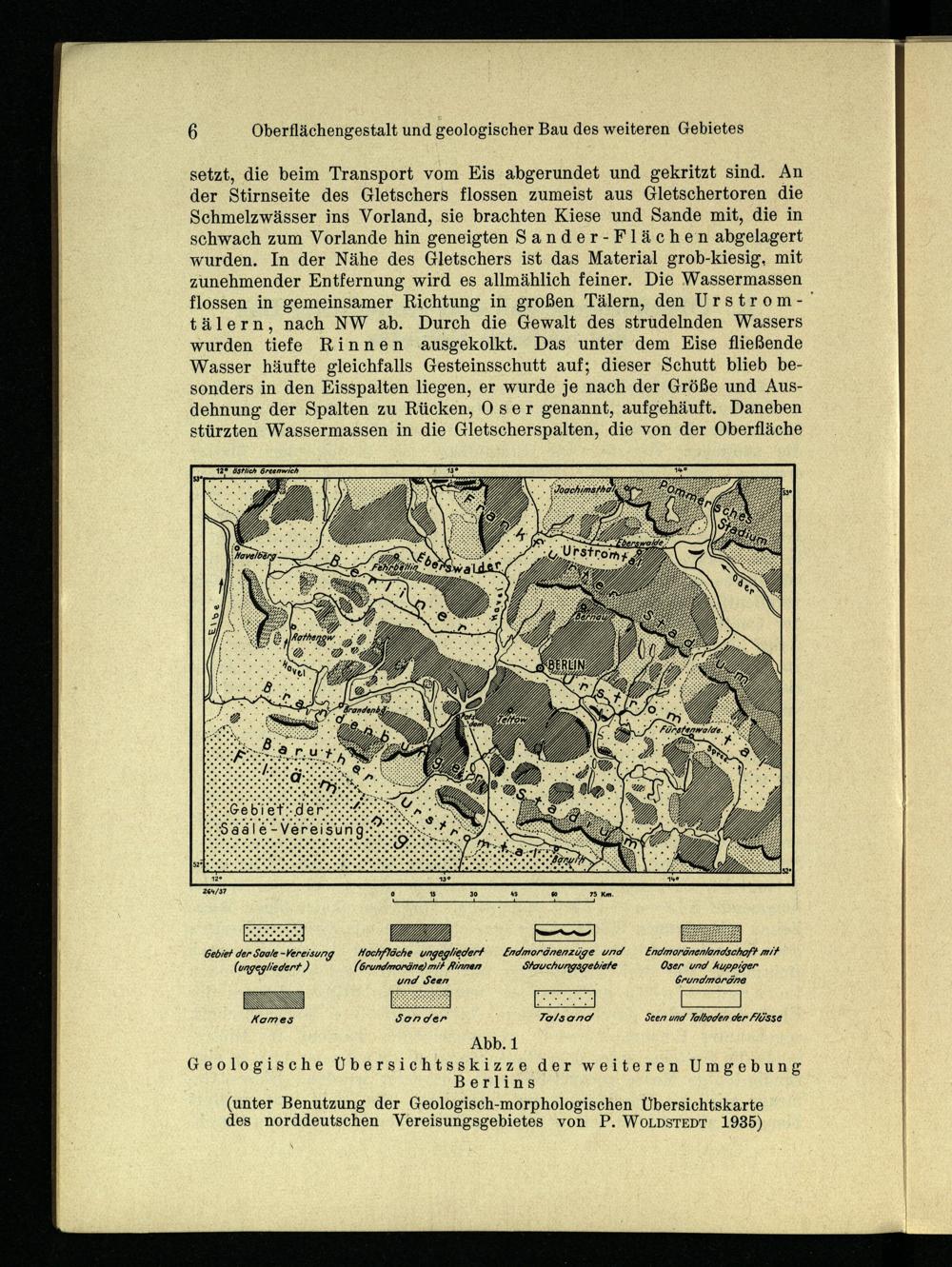 Gebiet der Saale-Vereisung Hochfläche ungegliedert Endmoränenzüge und Endmorönenlandschoft mit (ungegliedert)(Grundmoräne) mit Rinnem Stauchungsgebiete Oser und kuppiger Se Grundmordne Komes Sonder Tolsand Seen und Talboden der Flüsse Abb. 1 Geologische Übersichtsskizze der weiteren Umgebung Berlins