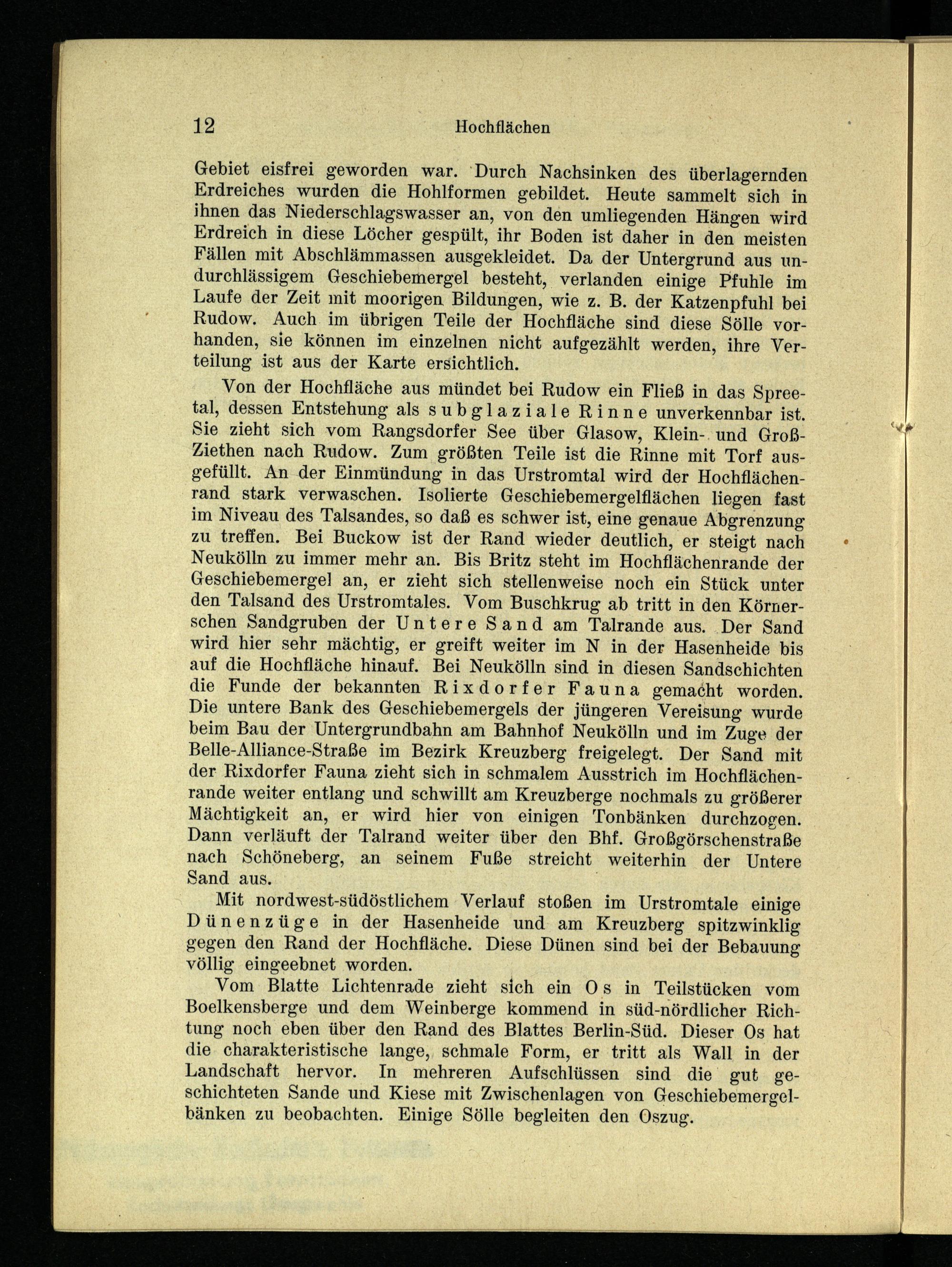 Von der Hochfläche aus mündet bei Rudow ein Fließ in das Spreetal, dessen Entstehung als subglaziale Rinne unverkennbar ist. Sie zieht sich vom Rangsdorfer See über Glasow, Klein-. und GroßZiethen nach Rudow. Zum größten Teile ist die Rinne mit Torf ausgefüllt. An der Einmündung in das Urstromtal wird der Hochflächenrand stark verwaschen. Isolierte Geschiebemergelflächen liegen fast im Niveau des Talsandes, so daß es schwer ist, eine genaue Abgrenzung zu treffen. Bei Buckow ist der Rand wieder deutlich, er steigt nach Neukölln zu immer mehr an. Bis Britz steht im Hochflächenrande der Geschiebemergel an, er zieht sich stellenweise noch ein Stück unter den Talsand des Urstromtales. Vom Buschkrug ab tritt in den Körnerschen Sandgruben der Untere Sand am Talrande aus. Der Sand wird hier sehr mächtig, er greift weiter im N in der Hasenheide bis auf die Hochfläche hinauf. Bei Neukölln sind in diesen Sandschichten die Funde der bekannten Rixdorfer Fauna gemacht worden. Die untere Bank des Geschiebemergels der jüngeren Vereisung wurde beim Bau der Untergrundbahn am Bahnhof Neukölln und im Zuge der Belle-Alliance-Straße im Bezirk Kreuzberg freigelegt. Der Sand mit der Rixdorfer Fauna zieht sich in schmalem Ausstrich im Hochflächenrande weiter entlang und schwillt am Kreuzberge nochmals zu größerer Mächtigkeit an, er wird hier von einigen Tonbänken durchzogen. Dann verläuft der Talrand weiter über den Bhf. Großgörschenstraße nach Schöneberg, an seinem Fuße streicht weiterhin der Untere Sand aus.;