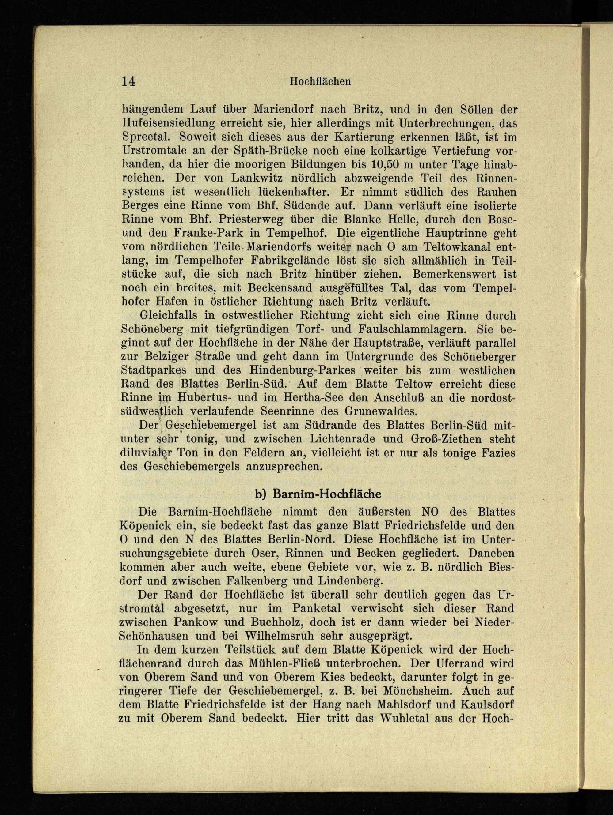 hängendem Lauf über Mariendorf nach Britz, und in den Söllen der Hufeisensiedlung erreicht sie, hier allerdings mit Unterbrechungen, das Spreetal. Soweit sich dieses aus der Kartierung erkennen läßt, ist im Urstromtale an der Späth-Brücke noch eine kolkartige Vertiefung vorhanden, da hier die moorigen Bildungen bis 10,50 m unter Tage hinabreichen. Der von Lankwitz nördlich abzweigende Teil des Rinnensystems ist wesentlich lückenhafter. Er nimmt südlich des Rauhen Berges eine Rinne vom Bhf. Südende auf. Dann verläuft eine isolierte Rinne vom Bhf. Priesterweg über die Blanke Helle, durch den Boseund den Franke-Park in Tempelhof. Die eigentliche Hauptrinne geht vom nördlichen Teile. Mariendorfs weiter nach 0 am Teltowkanal entlang, im"Tempelhofer Fabrikgelände löst sie sich allmählich in: Teilstücke auf, die sich nach Britz hinüber ziehen. Bemerkenswert ist noch ein breites, mit Beckensand ausgefülltes Tal, das vom Tempelhofer Hafen in östlicher Richtung nach Britz verläuft.