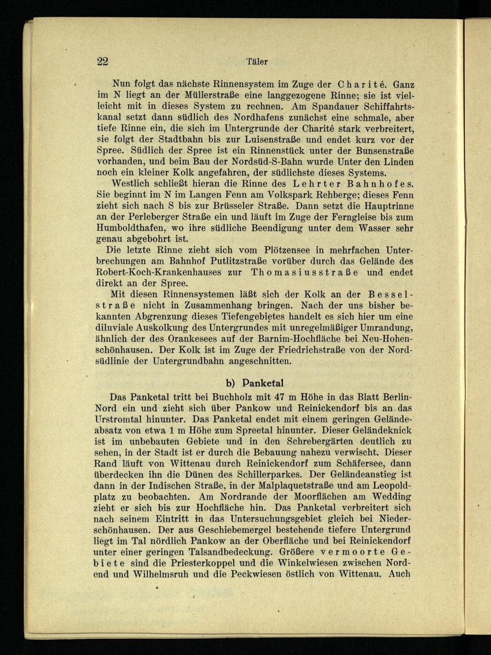 Das Panketal tritt bei Buchholz mit 47 m Höhe in das Blatt BerlinNord ein und zieht sich über Pankow und Reinickendorf bis an.das Urstromtal hinunter. Das Panketal endet mit einem geringen Gelände-‘ absatz von etwa 1 m Höhe zum Spreetal hinunter. Dieser Geländeknick ist im unbebauten Gebiete und in den Schrebergärten deutlich zu sehen, in der Stadt ist er durch die Bebauung nahezu verwischt. Dieser Rand läuft von Wittenau durch Reinickendorf zum Schäfersee, dann überdecken ihn die Dünen des Schillerparkes. Der Geländeanstieg ist dann in der Indischen Straße, in der Malplaquetstraße und am Leopoldplatz zu beobachten. Am Nordrande der Moorflächen am Wedding zieht er sich bis zur Hochfläche hin. Das Panketal verbreitert sich nach seinem Eintritt in das Untersuchungsgebiet gleich bei Niederschönhausen. Der aus Geschiebemergel bestehende tiefere Untergrund liegt im Tal nördlich Pankow an der Oberfläche und bei Reinickendorf unter einer geringen Talsandbedeckung. Größere vermoorte Gebiete sind die Priesterkoppel und die Winkelwiesen zwischen Nordend und Wilhelmsruh und die Peckwiesen östlich von Wittenau. Auch