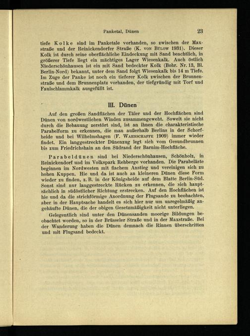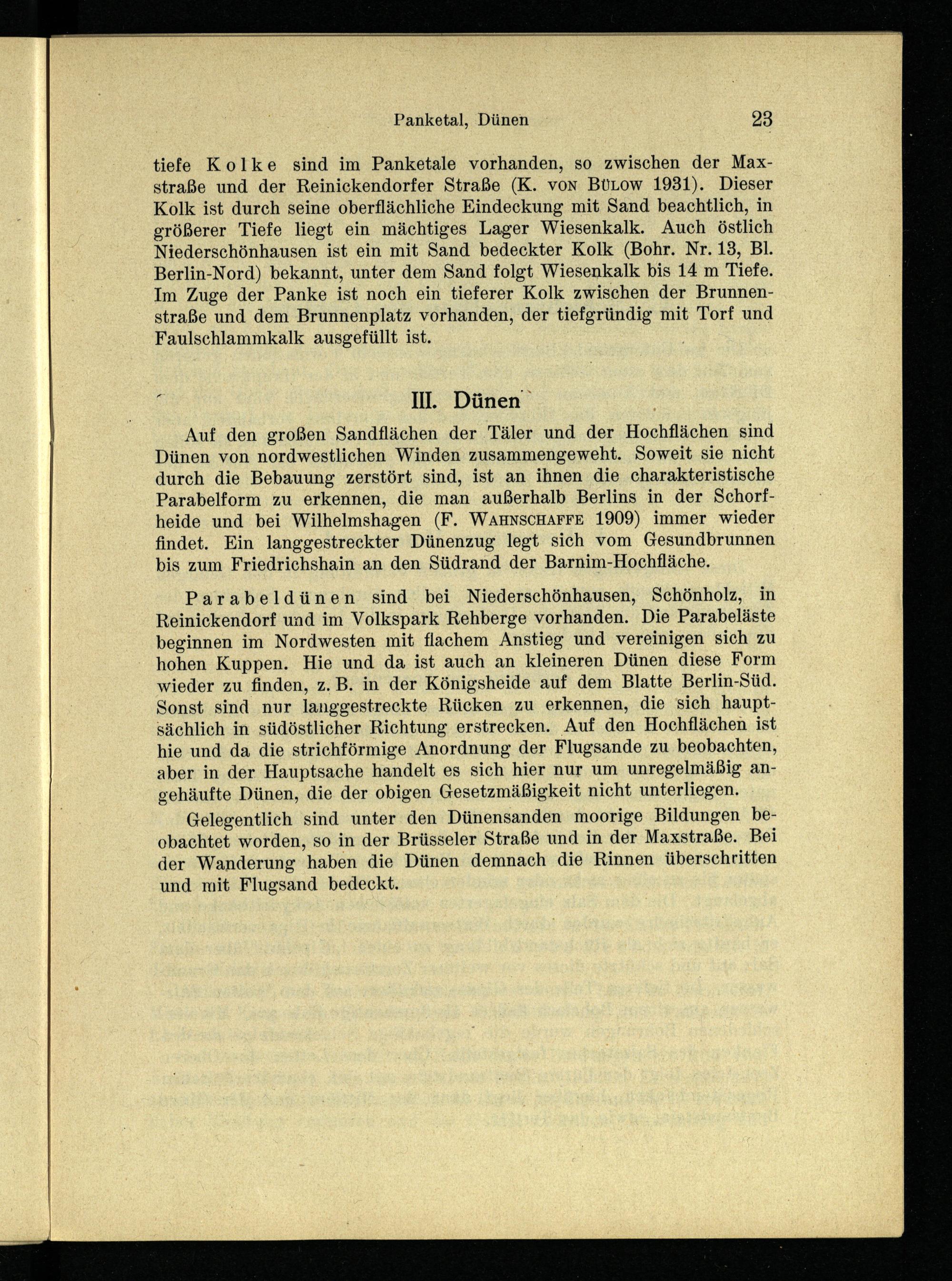 Parabeldünen sind bei Niederschönhausen, Schönholz, in Reinickendorf und im Volkspark Rehberge vorhanden. Die Parabeläste beginnen im Nordwesten mit flachem Anstieg und vereinigen sich zu hohen Kuppen. Hie und da ist auch an kleineren Dünen diese Form wieder zu finden, z. B. in der Königsheide auf dem Blatte Berlin-Süd. Sonst sind nur langgestreckte Rücken zu erkennen, die sich hauptsächlich in südöstlicher Richtung erstrecken. Auf den Hochflächen ist hie und da die strichförmige Anordnung der Flugsande zu beobachten, aber in der Hauptsache handelt es sich hier nur um unregelmäßig angehäufte Dünen, die der obigen Gesetzmäßigkeit nicht unterliegen.