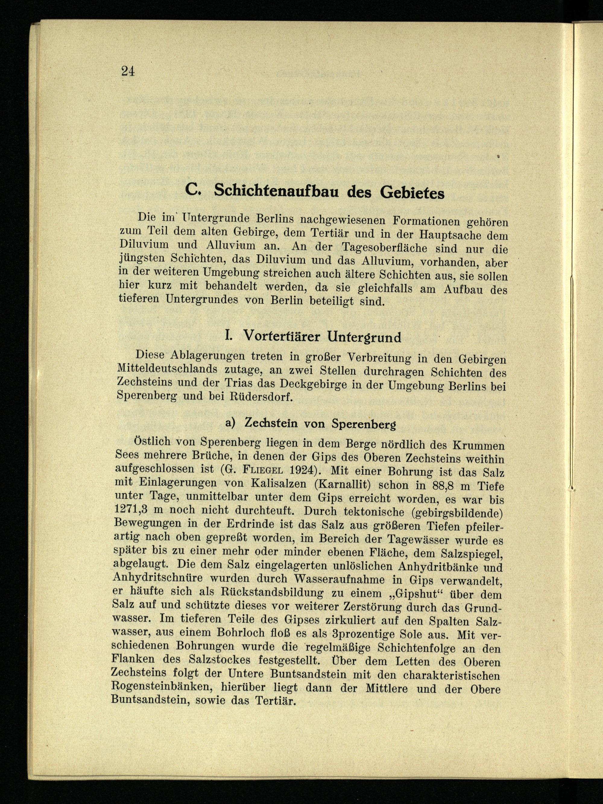 Östlich von Sperenberg liegen in dem Berge nördlich des Krummen Sees mehrere Brüche, in denen der Gips des Oberen Zechsteins weithin aufgeschlossen ist(G. FLIEGEL 1924). Mit einer Bohrung ist das Salz mit Einlagerungen von Kalisalzen(Karnallit) schon in 88,8 m Tiefe unter Tage, unmittelbar unter dem Gips erreicht worden, es war bis 1271,3 m noch nicht durchteuft. Durch tektonische(gebirgsbildende) Bewegungen in der Erdrinde ist das Salz aus größeren Tiefen pfeilerartig nach oben gepreßt worden, im Bereich der Tagewässer wurde es später bis zu einer mehr oder minder ebenen Fläche, dem Salzspiegel, abgelaugt. Die dem Salz eingelagerten unlöslichen Anhydritbänke und Anhydritschnüre wurden durch Wasseraufnahme in Gips verwandelt, er häufte sich als Rückstandsbildung zu einem„Gipshut“ über dem Salz auf und schützte dieses vor weiterer Zerstörung durch das Grundwasser. Im tieferen Teile des Gipses zirkuliert auf den Spalten Salzwasser, aus einem Bohrloch floß es als 3prozentige Sole aus. Mit verschiedenen Bohrungen wurde die regelmäßige Schichtenfolge an den Flanken des Salzstockes festgestellt. Über dem Letten des Oberen Zechsteins folgt der Untere Buntsandstein mit den charakteristischen Rogensteinbänken, hierüber liegt dannı der Mittlere und der Obere Buntsandstein, sowie das Tertiär.;