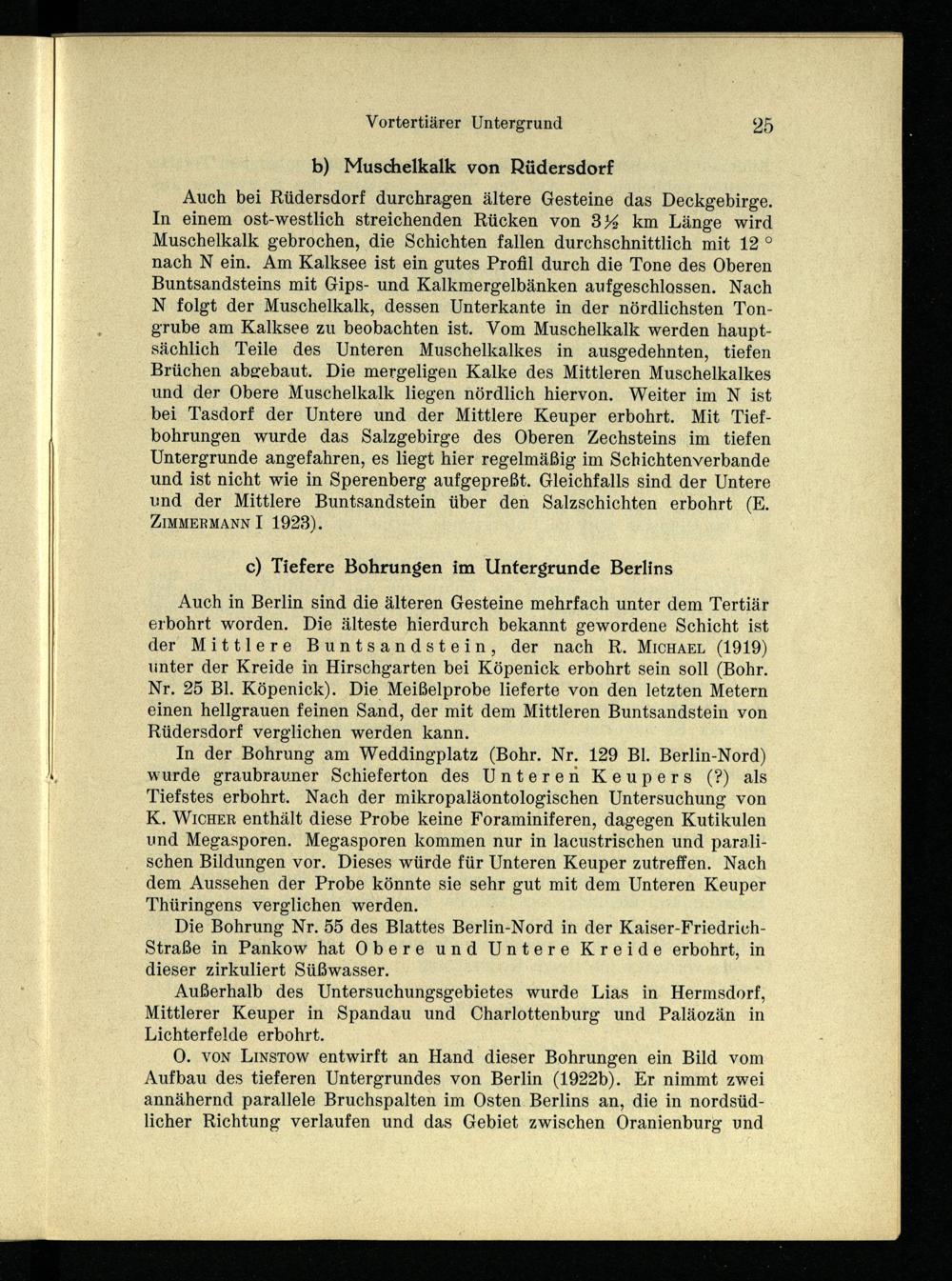 Auch in Berlin sind die älteren Gesteine mehrfach unter dem Tertiär erbohrt worden. Die älteste hierdurch bekannt gewordene Schicht ist der Mittlere Buntsandstein, der nach R. MicHAEL(1919) unter der Kreide in Hirschgarten bei Köpenick erbohrt sein soll(Bohr. Nr. 25 Bl. Köpenick). Die Meißelprobe lieferte von den letzten Metern einen hellgrauen feinen Sand, der mit dem Mittleren Buntsandstein von Rüdersdorf verglichen werden kann.