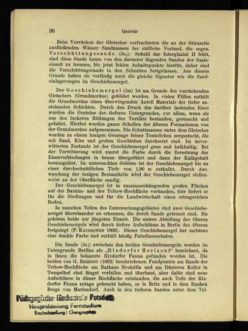 Die Sande(ös;) zwischen den beiden Geschiebemergeln werden im Untergrunde Berlins als„Rixdorfer Horizont‘“ bezeichnet, da in ihnen die bekannte Rixdorfer Fauna gefunden worden ist. Die beiden von G. BERENDT(1882) beschriebenen Fundpunkte am Rande der Teltow-Hochfläche am Rathaus Neukölln und am Düsteren Keller in Tempelhof sind längst verfallen und überbaut, aber dafür sind neue Aufschlüsse in dieser Hochfläche entstanden, die auch Teile der Rixdorfer Fauna zutage gebracht haben, so in Britz und in dem Rauhen Berge von Mariendorf. Auch in den tieferen Sanden unter dem Tal