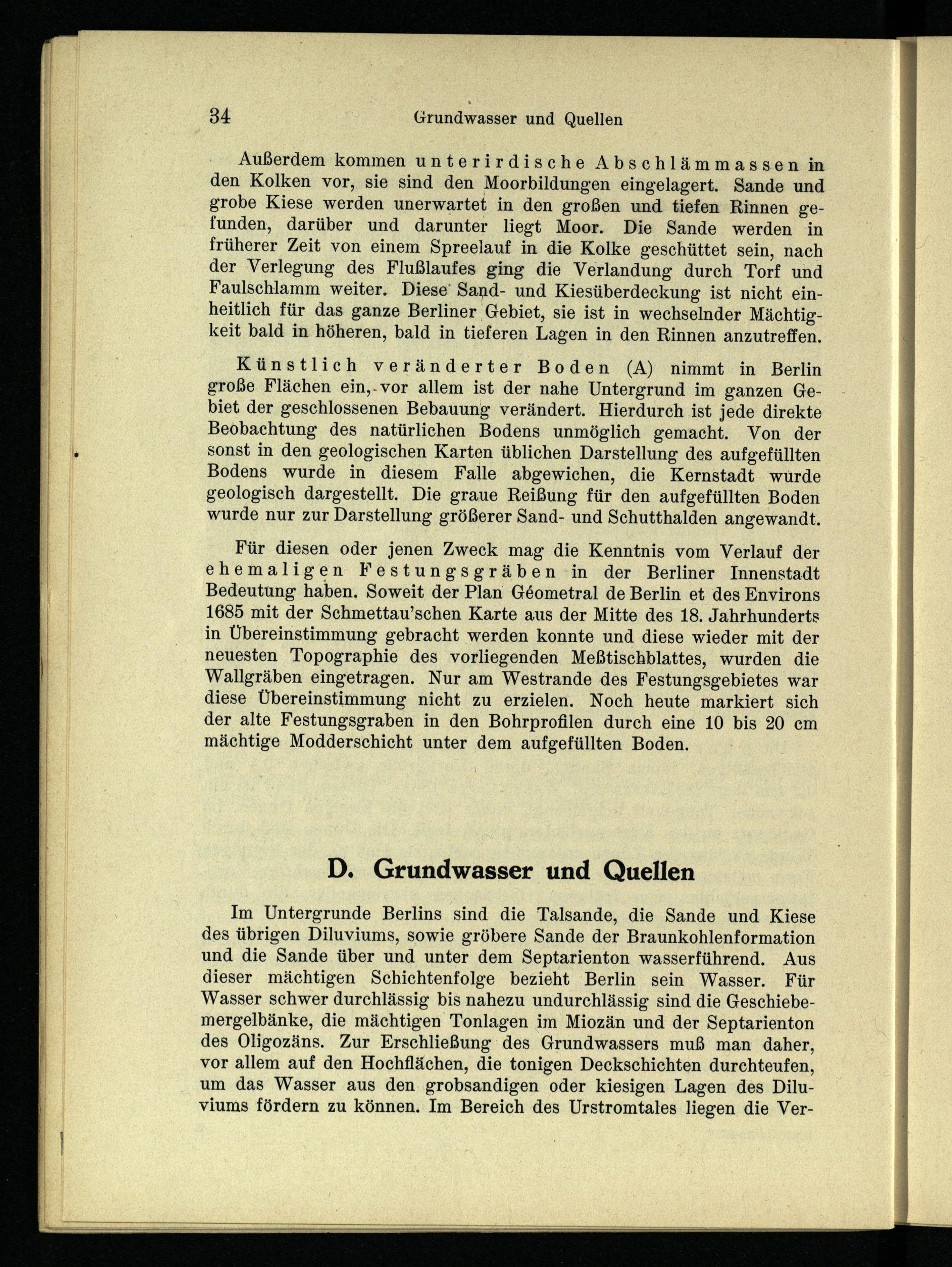 Im Untergrunde Berlins sind die Talsande, die Sande und Kiese des übrigen Diluviums, sowie gröbere Sande der Braunkohlenformation und die Sande über und unter dem Septarienton wasserführend. Aus dieser mächtigen Schichtenfolge bezieht Berlin sein Wasser. Für Wasser schwer durchlässig bis nahezu undurchlässig sind die Geschiebemergelbänke, die mächtigen Tonlagen im Miozän und der Septarienton des Oligozäns. Zur Erschließung des Grundwassers muß man daher, vor allem auf den Hochflächen, die tonigen Deckschichten durchteufen, um das Wasser aus den. grobsandigen oder kiesigen Lagen des Diluviums fördern zu können. Im Bereich des Urstromtales liegen die Ver