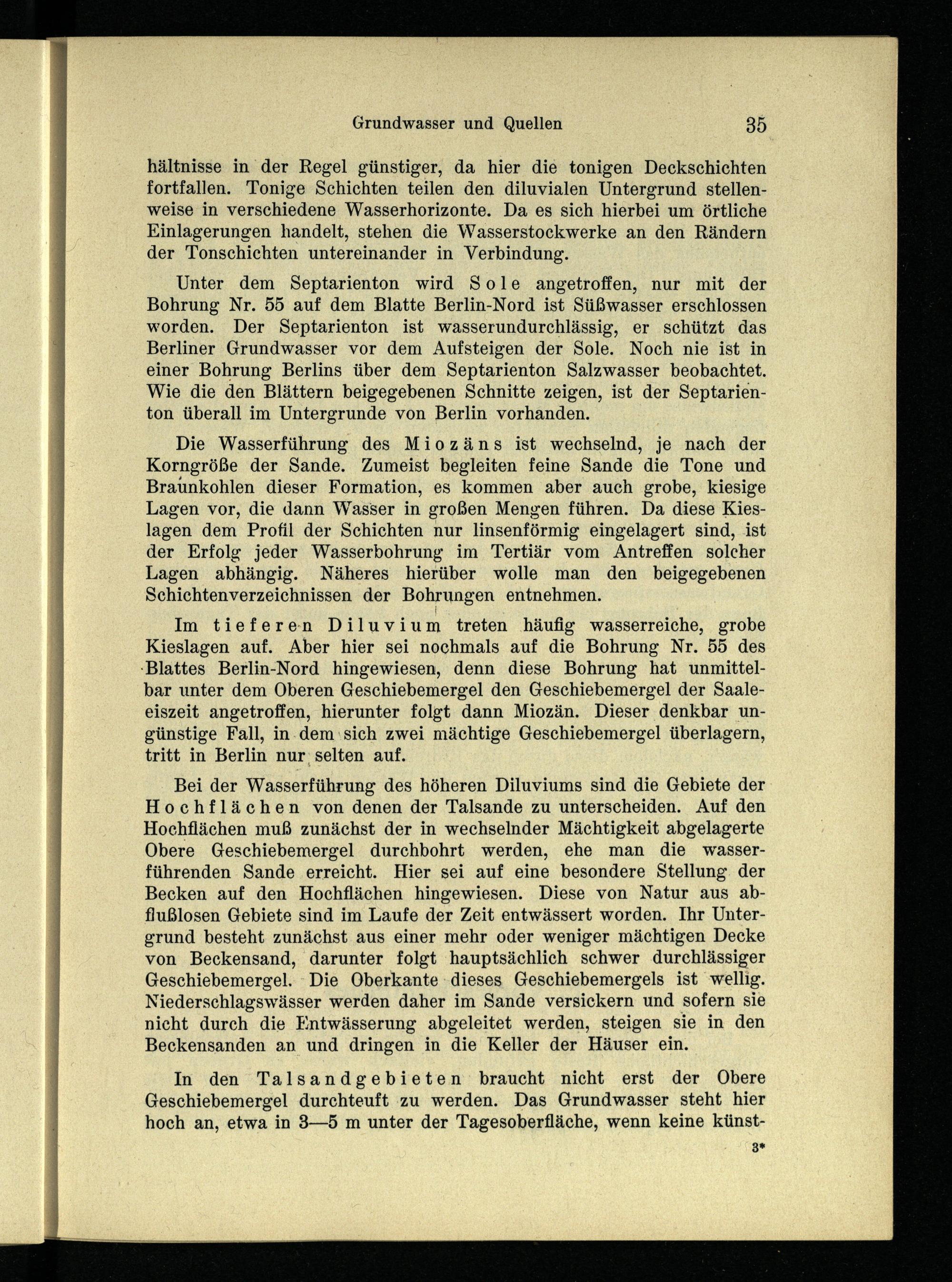 Unter dem Septarienton wird Sole angetroffen, nur mit der Bohrung Nr. 55 auf dem Blatte Berlin-Nord ist Süßwasser erschlossen worden. Der Septarienton ist wasserundurchlässig, er schützt das Berliner Grundwasser vor dem Aufsteigen der Sole. Noch nie ist in einer Bohrung Berlins über dem Septarienton Salzwasser beobachtet. Wie die den Blättern beigegebenen Schnitte zeigen, ist der Septarienton überall im Untergrunde von Berlin vorhanden.