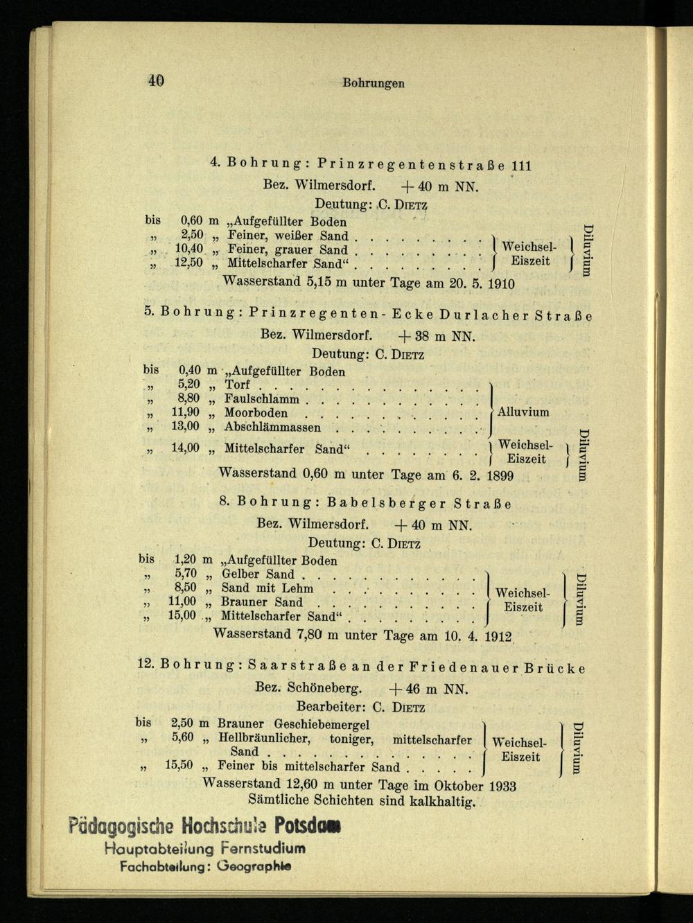Bez. Wilmersdorf.+40 m NN. Deutung: C. DIETZ_ m„Aufgefüllter Boden » Gelber Sand, 10 „ Sand mit Lehm.. 0... NH weichsel. „ Brauner Sand‘, 0 MN Eiszeit .„ Mittelscharfer Sand“,