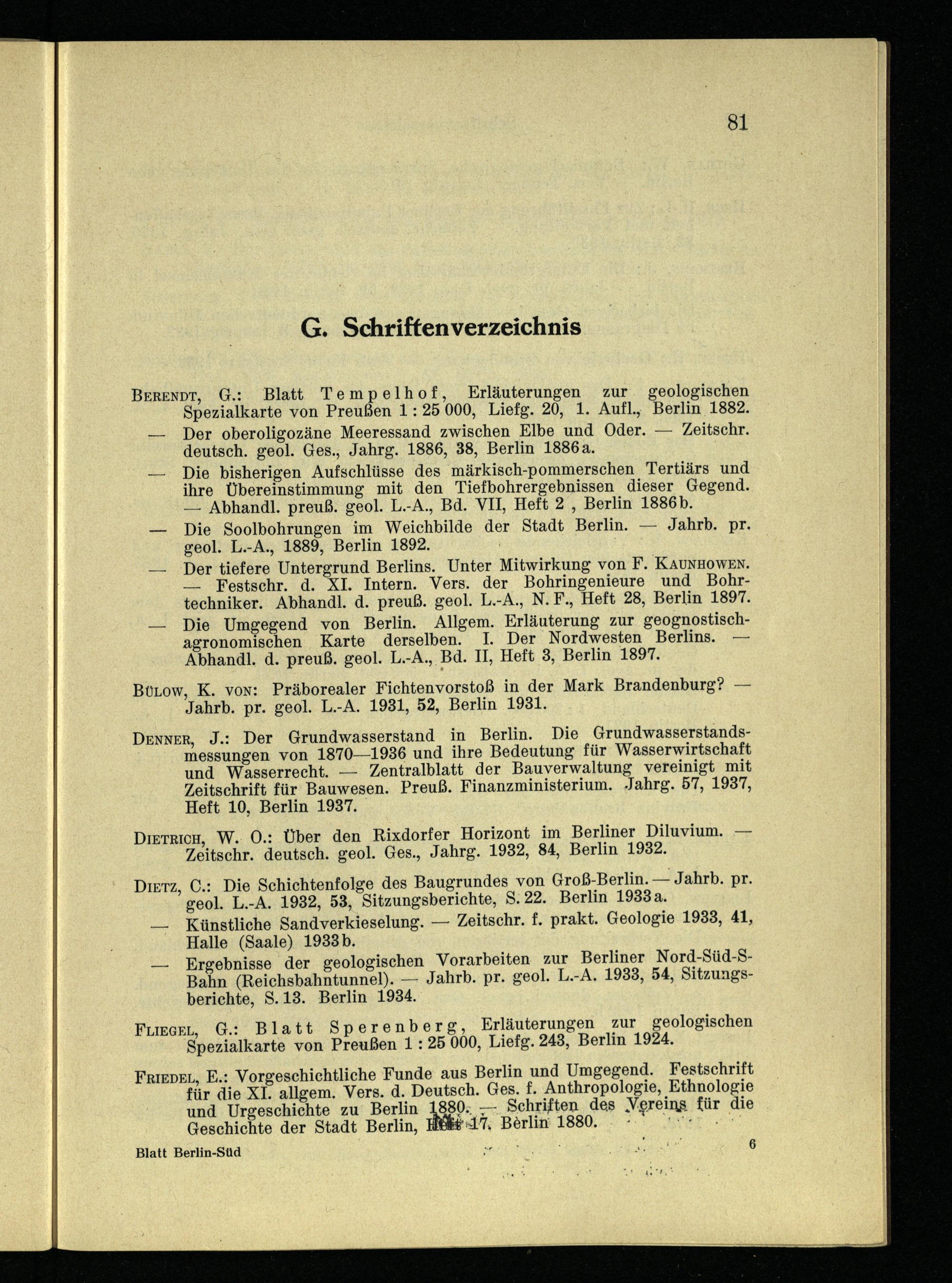 BERENDT, G.: Blatt Tempelhof, Erläuterungen zur geologischen Spezialkarte von Preußen 1: 25 000, Liefg. 20, 1. Aufl. Berlin 1882. Der oberoligozäne Meeressand zwischen Elbe und Oder.— Zeitschr. deutsch. geol. Ges., Jahrg. 1886, 38, Berlin 1886a.
