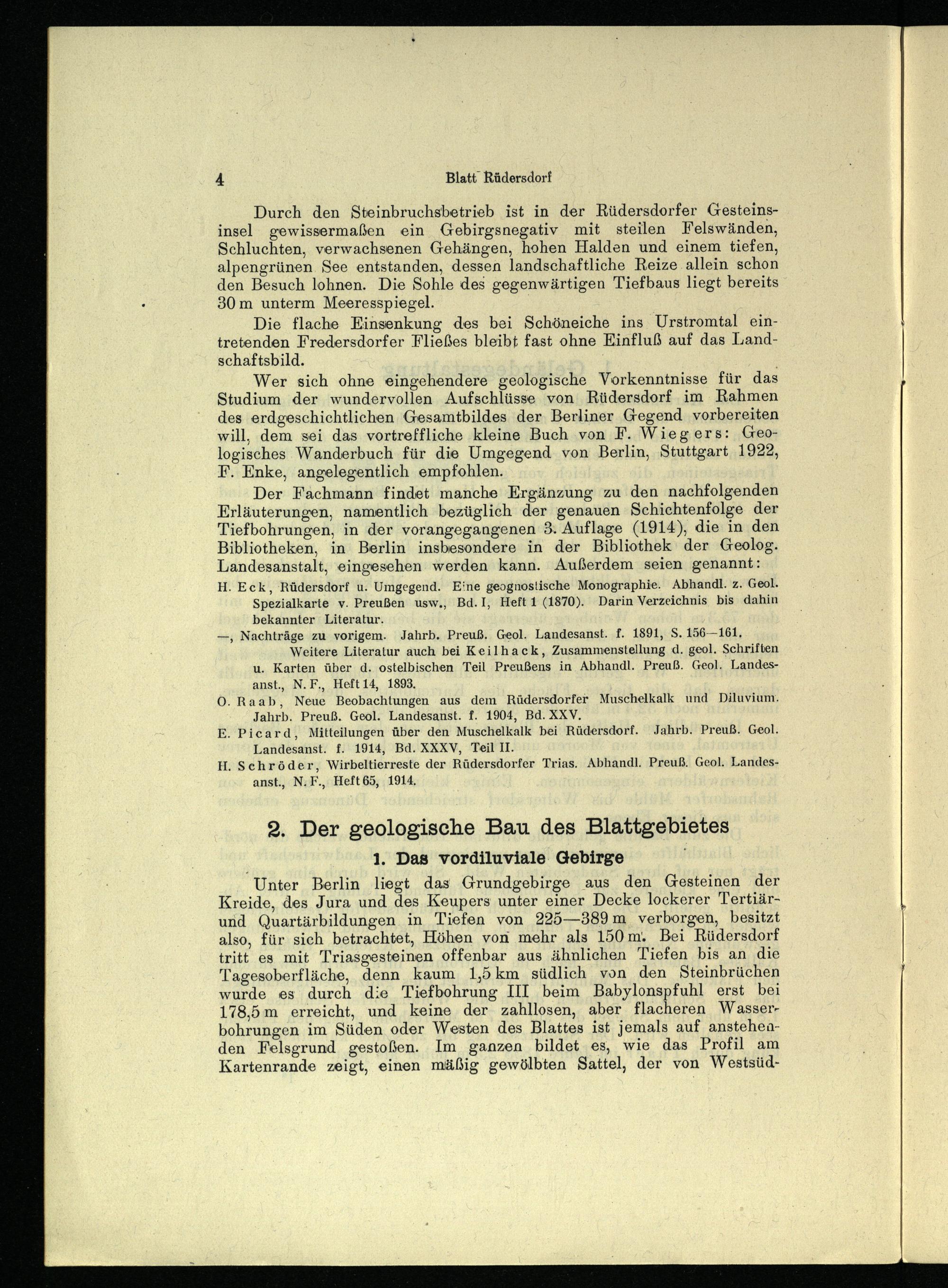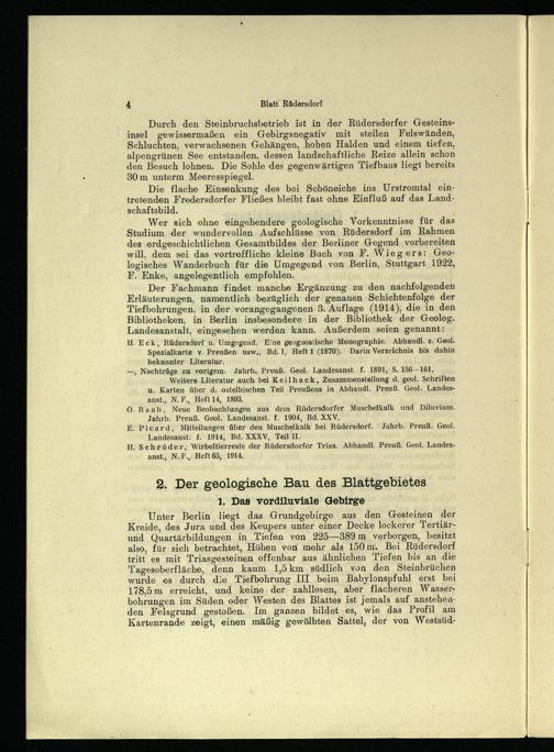Der Fachmann findet manche Ergänzung zu den nachfolgenden Erläuterungen, namentlich bezüglich der genauen Schichtenfolge der Tiefbohrungen, in der vorangegangenen 3. Auflage(1914), die in den Bibliotheken, in Berlin insbesondere in der Bibliothek der Geolog. Landesanstalt, eingesehen werden kann. Außerdem seien genannt: H. Eck, Rüdersdorf u. Umgegend. Eine geognostische Monographie. Abhandl. z. Geol.