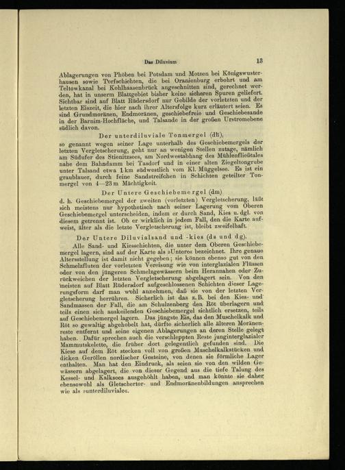 Ablagerungen von Phöben bei Potsdam und Motzen bei Königswusterhausen. sowie Torfschichten, die bei Oranienburg erbohrt und am Teltowkanal bei Kohlhaasenbrück angeschnitten sind, gerechnet werden, hat in unserm Blattgebiet bisher keine sicheren Spuren geliefert. Sichtbar sind auf Blatt Rüdersdorf nur Gebilde der vorletzten und der letzten Eiszeit, die ‚hier nach ihrer Altersfolge kurz erläutert seien. Es sind Grundmoränen, Endmoränen, geschiebefreie und Geschiebesande in der Barnim-Hochfläche, und Talsande in der großen Urstromebene südlich davon. Der unterdiluviale Tonmergel(db),