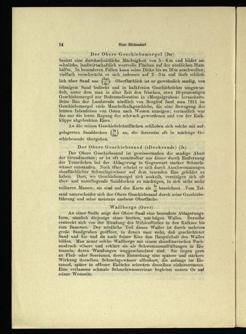 teilbaren Massen; sie sind auf der Karte als es bezeichnet. Vom'"Talsand‘ unterscheidet sich der Obere Geschiebesand durch seine Geschiebeführung und seine meistens unebene Oberfläche.
