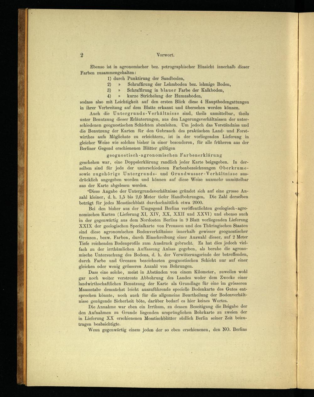 Bei den bisher aus der Umgegend Berlins veröffentlichten geologisch- agronomischen Karten(Lieferung XI, XIV, XX, XXIII und XXVI) und ebenso auch in der gegenwärtig aus dem Nordosten Berlins in 9 Blatt vorliegenden Lieferung XXIX der geologischen Specialkarte von Preussen und den Thüringischen Staaten sind diese agronomischen Bodenverhältnisse innerhalb gewisser geognostischer Grenzen, bezw. Farben, durch Einschreibung einer Auswahl dieser, auf 2 Meter Tiefe reichenden Bodenprofile zum Ausdruck gebracht. Es hat dies jedoch vielfach zu der irrthümlichen Auffassung Anlass gegeben, als beruhe die agronomische Untersuchung des Bodens, d. h. der Verwitterungsrinde der betreffenden, durch Farbe und Grenzen bezeichneten geognostischen Schicht nur auf einer gleichen oder wenig grösseren Anzahl von Bohrungen.