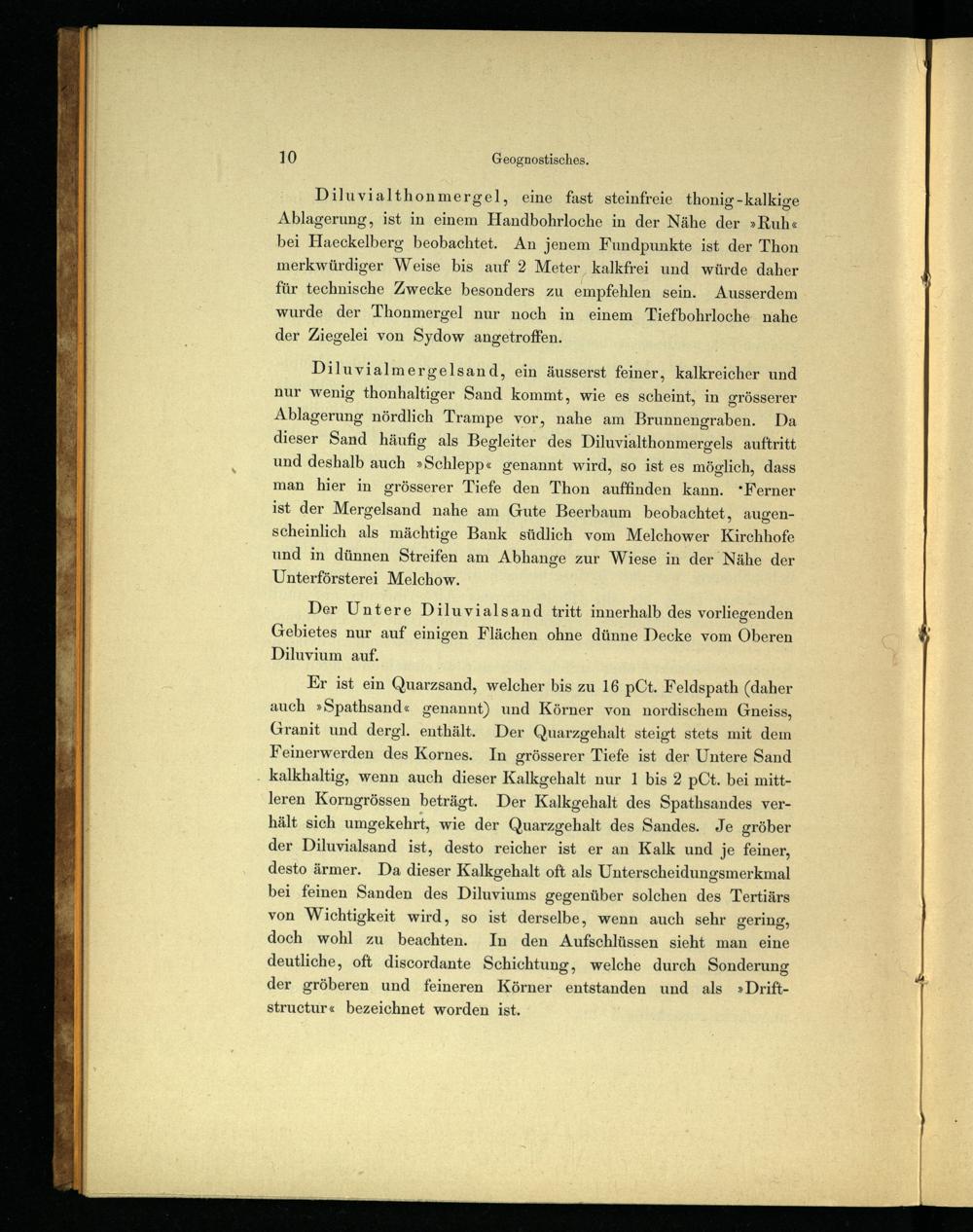 Diluvialmergelsand, ein äusserst feiner, kalkreicher und nur wenig thonhaltiger Sand kommt, wie es scheint, in grösserer Ablagerung nördlich Trampe vor, nahe am Brunnengraben. Da dieser Sand häufig als Begleiter des Diluvialthonmergels auftritt und deshalb auch»Schlepp« genannt wird, so ist es möglich, dass man hier in grösserer Tiefe den Thon auffinden kann.-Ferner ist der Mergelsand nahe am Gute Beerbaum beobachtet, augenscheinlich als mächtige Bank südlich vom Melchower Kirchhofe und in dünnen Streifen am Abhange zur Wiese in der Nähe der Unterförsterei Melchow.
