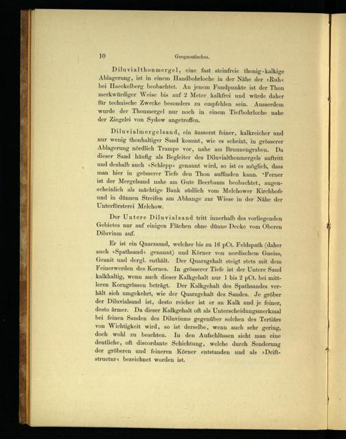 Diluvialthonmergel, eine fast steinfreie thonig-kalkige Ablagerung, ist in einem Handbohrloche in der Nähe der»Ruh« bei Haeckelberg beobachtet. An jenem Fundpunkte ist der Thon merkwürdiger Weise bis auf 2 Meter, kalkfrei und würde daher für technische Zwecke besonders zu empfehlen sein. Ausserdem wurde der Thonmergel nur noch in einem Tiefbohrloche nahe der Ziegelei von Sydow angetroffen.