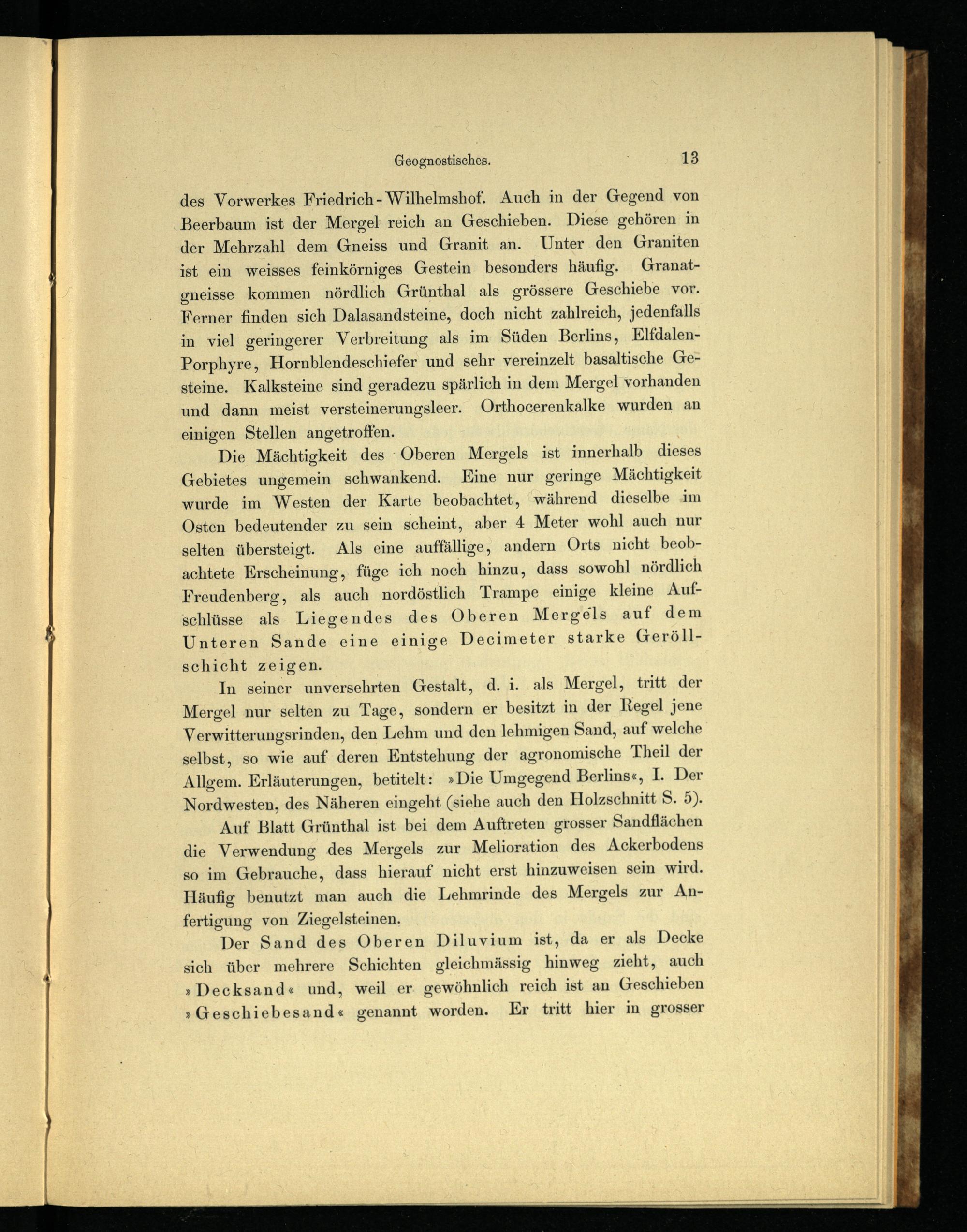 In seiner unversehrten Gestalt, d. i. als Mergel, tritt der Mergel nur selten zu Tage, sondern er besitzt in der Regel jene Verwitterungsrinden, den Lehm und den lehmigen Sand, auf welche selbst, so wie auf deren Entstehung der agronomische Theil der Allgem. Erläuterungen, betitelt:»Die Umgegend Berlins«, I. Der Nordwesten, des Näheren eingeht(siehe auch den Holzschnitt S. 5).