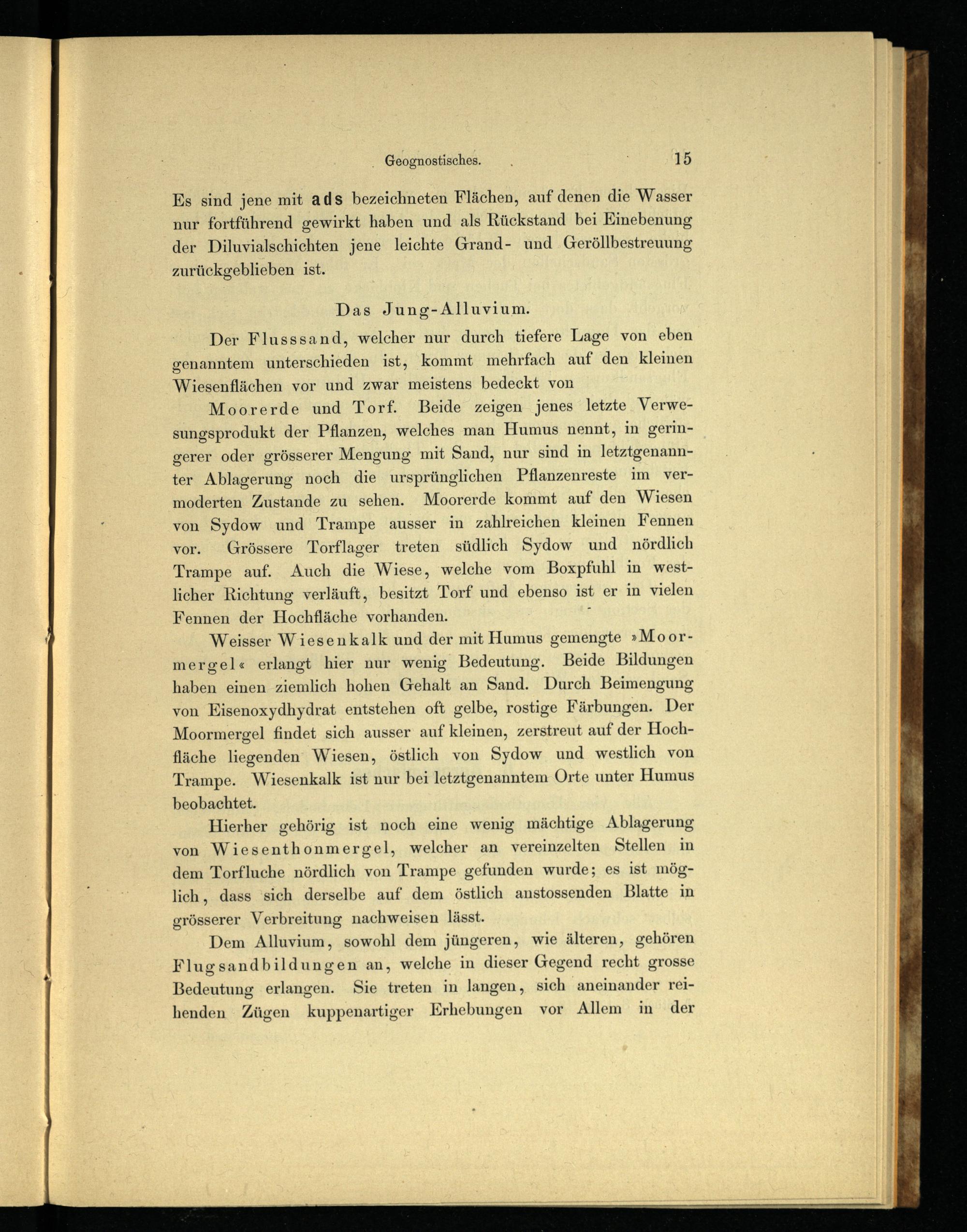 Moorerde und Torf. Beide zeigen. jenes letzte Verwesungsprodukt der Pflanzen, welches man Humus nennt, in geringerer oder grösserer Mengung mit Sand, nur sind in letztgenannter Ablagerung noch die ursprünglichen Pflanzenreste im vermoderten Zustande zu sehen. Moorerde kommt auf den Wiesen von Sydow und Trampe ausser in zahlreichen kleinen Fennen vor. Grössere Torflager treten südlich Sydow und nördlich Trampe auf. Auch die Wiese, welche vom Boxpfuhl in westlicher Richtung verläuft, besitzt Torf und ebenso ist er in vielen Fennen der Hochfläche vorhanden.)