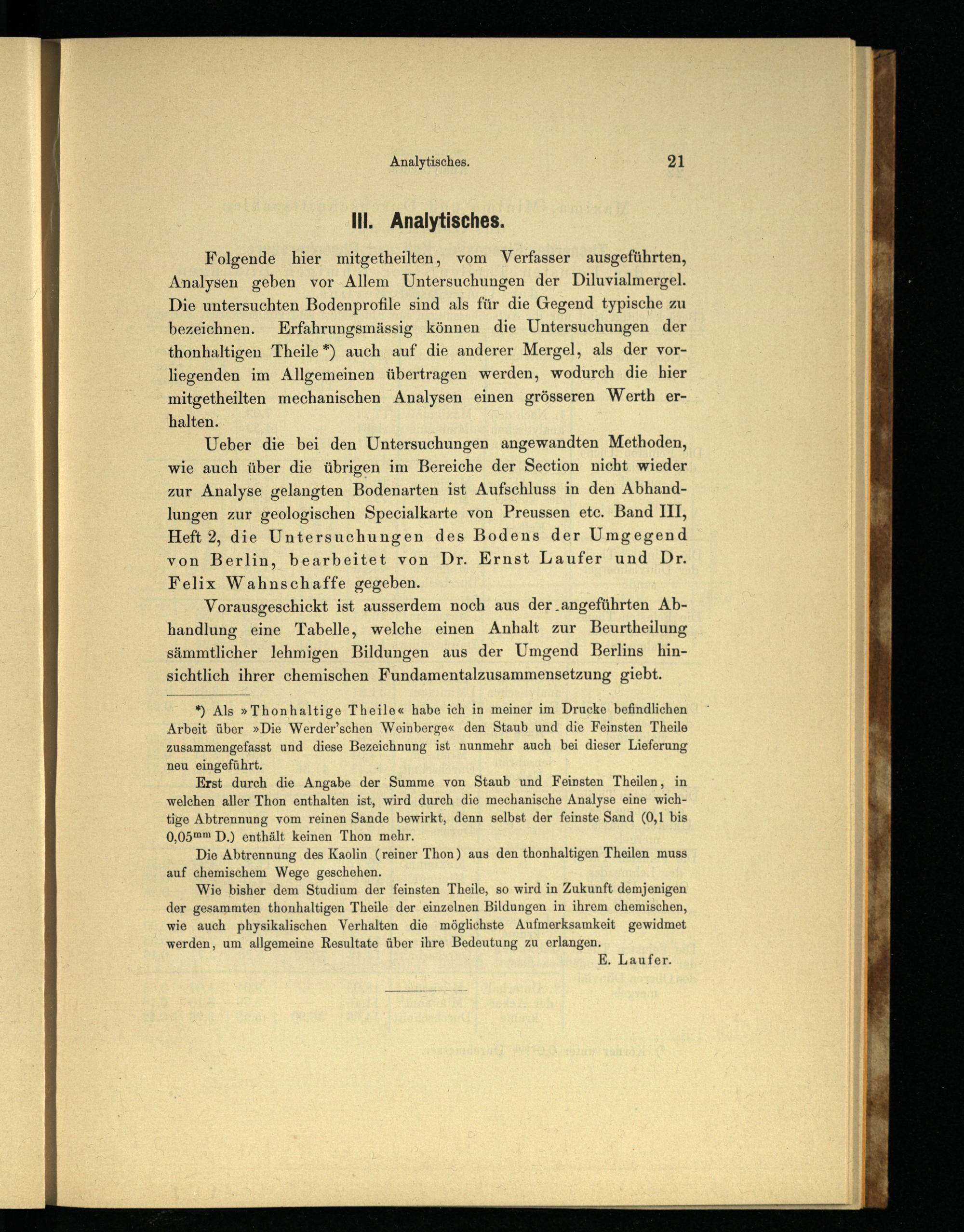 Ueber die bei den Untersuchungen angewandten Methoden, wie auch über die übrigen im Bereiche der Section nicht wieder zur Analyse gelangten Bodenarten ist Aufschluss in den Abhandlungen zur geologischen Specialkarte von Preussen etc. Band III, Heft 2, die Untersuchungen des Bodens der Umgegend von Berlin, bearbeitet von Dr. Ernst Laufer und Dr. Felix Wahnschaffe gegeben.