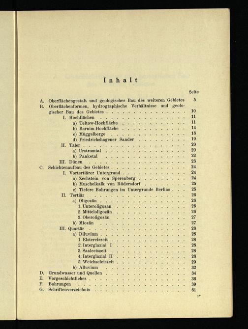 Oberflächengestalt und geologischer Bau des weiteren Gebietes Oberflächenformen, hydrographische Verhältnisse und geologischer Bau des Gebietes. ae I. Hochflächen. a) Teltow-Hochfläche b) Barnim-Hochfläche c) Müggelberge d) Friedrichshagener Sander IL. Täler. a) Urstromtal b) Panketal III. Dünen Schichtenaufbau des Gebietes. I. Vortertiärer Untergrund. a) Zechstein von Sperenberg b) Muschelkalk von Rüdersdorf; c) Tiefere Bohrungen im Untergrunde Berlins. II. Tertiär a) Oligozän 1. Unteroligozän 2, Mitteloligozän 3. Oberoligozän b) Miozän III. Quartär a) Diluvium. 1. Elstereiszeit. 2. Interglazial I 3. Saaleeiszeit 4. Interglazial II 5. Weichseleiszeit. b) Alluvium Grundwasser und Quellen Vorgeschichtliches. Bohrungen; Schriftenverzeichnis