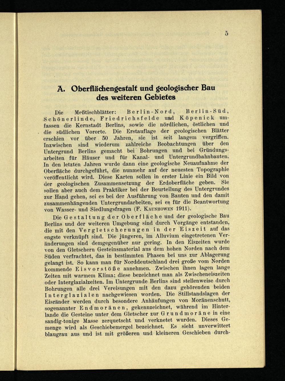 Die Meßtischblätter: Berlin-Nord, Berlin-Süd, Schönerlinde, Friedrichsfelde und Köpenick umfassen die Kernstadt Berlins, sowie die nördlichen, östlichen und die südlichen Vororte. Die Erstauflage der geologischen Blätter erschien vor über. 50 Jahren, sie ist seit langem vergriffen. Inzwischen sind wiederum zahlreiche Beobachtungen über den Untergrund Berlins gemacht bei‘ Bohrungen und bei Gründungsarbeiten für Häuser und für Kanal- und Untergrundbahnbauten. In den letzten Jahren wurde dann eine geologische Neuaufnahme der Oberfläche durchgeführt, die nunmehr auf der neuesten Topographie veröffentlicht wird. Diese Karten sollen in erster Linie ein Bild von der geologischen Zusammensetzung der Erdoberfläche geben. Sie sollen aber auch dem Praktiker bei der Beurteilung des Untergrundes zur Hand gehen, sei es bei der Ausführung von Bauten und den damit zusammenhängenden Untergrundarbeiten, sei es für die Beantwortung von Wasser- und Siedlungsfragen(F. KAUNHOWEN 1911).