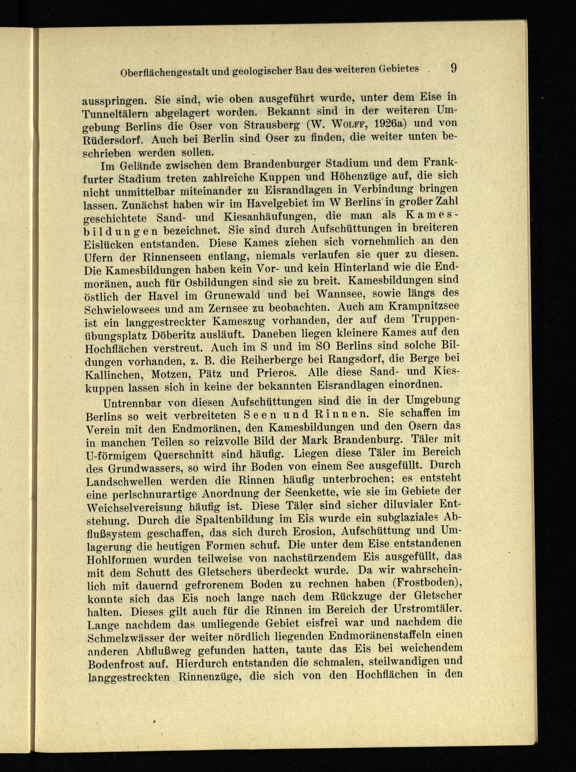 ausspringen. Sie sind, wie oben ausgeführt wurde, unter dem Eise in Tunneltälern abgelagert worden. Bekannt sind in der weiteren Umgebung Berlins die Oser von Strausberg(W. WorrFF, 1926a) und von Rüdersdorf. Auch bei Berlin sind Oser zu finden, die weiter unten beschrieben werden sollen.;