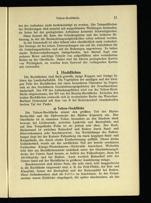 Die Teltow-Hochfläche nimmt den größten Teil des Blattes Berlin-Süd und die Südwestecke des Blattes Köpenick ein. Ihre Oberfläche ist in einzelnen Teilen, besonders an den Rändern stark bewegt, bei Lichtenrade, zwischen Lankwitz und Marienfelde und auf dem Tempelhofer Felde ist sie jedoch sehr eben. Der Hochflächenrand ist zwischen Bohnsdorf. und Rudow durch Sand- und Kiesvorkommen sehr beachtenswert.. Am Nordabhange des. Falkenberges liegt bei der Kolonie Falkenberg ein stark kuppiges Sand- und Kiesgelände, das durch starke Kiesbestreuung auffällt. Dieses kleine Geländestück wurde als der nördlichste Teil der bereits erwähnten Endmoräne Königs-Wusterhausen—Eichwalde bezeichnet. Weiterhin tritt. hier am Hochflächenrande mehrfach unter der Geschiebemergeldecke der Untere. Sand heraus, so östlich des Falkenberges, dann bei Alt-Glienicke und bei Rudow. Auch westlich Bohnsdorf tritt der Untere Sand auf der Hochfläche in größerer Ausdehnung zutage.