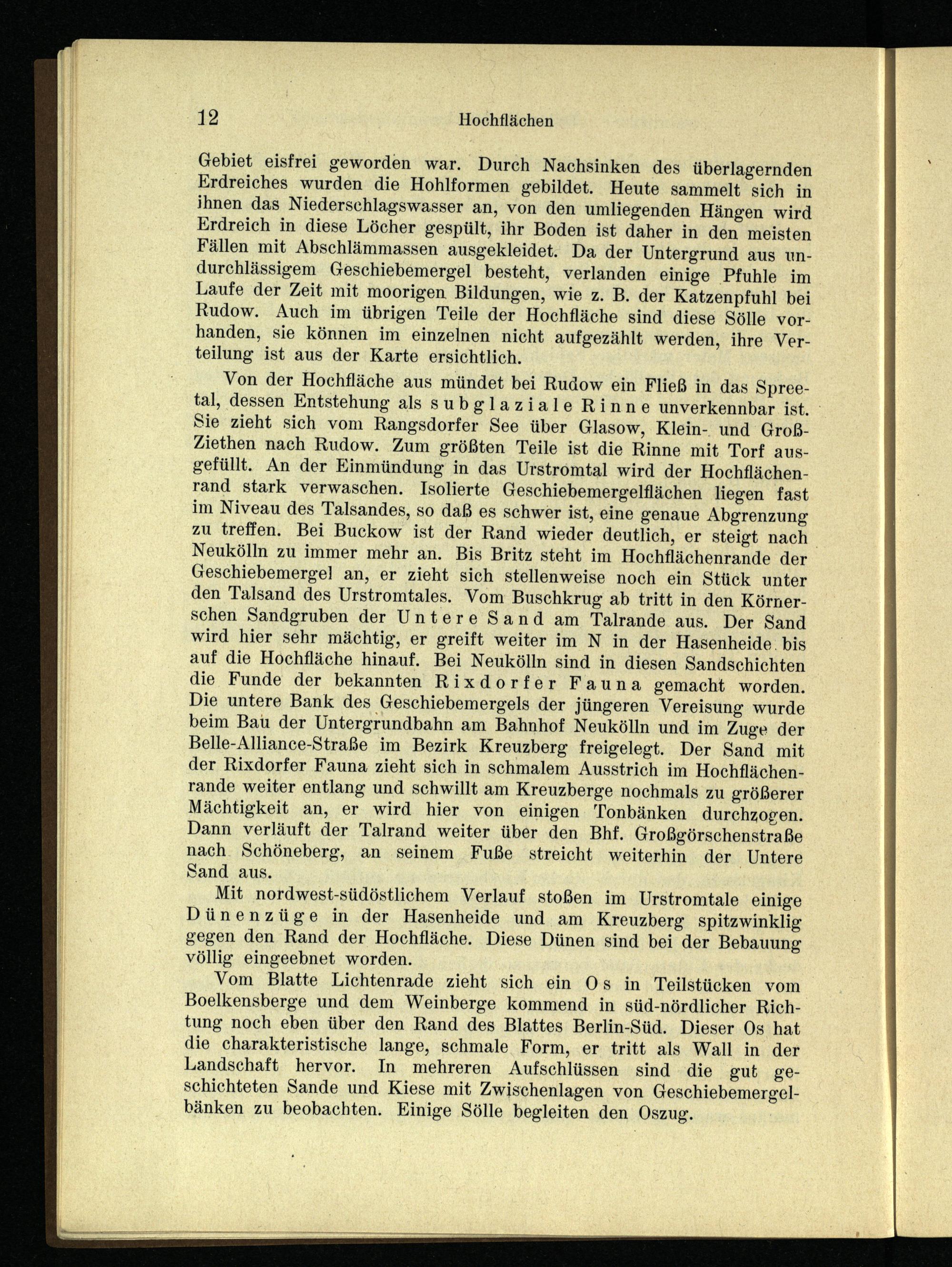Von der Hochfläche aus mündet bei Rudow ein Fließ in das Spreetal, dessen Entstehung als subglaziale Rinne unverkennbar ist. Sie zieht sich vom Rangsdorfer See über Glasow, Klein- und GroßZiethen nach Rudow. Zum größten Teile ist die Rinne mit Torf ausgefüllt. An der Einmündung in das Urstromtal wird der Hochflächenrand stark verwaschen. Isolierte Geschiebemergelflächen liegen fast im Niveau des Talsandes, so daß es schwer ist, eine genaue Abgrenzung zu treffen. Bei Buckow ist der Rand wieder deutlich, er steigt nach Neukölln zu immer mehr an. Bis Britz steht im Hochflächenrande der Geschiebemergel an, er zieht sich stellenweise noch ein Stick unter den Talsand des Urstromtales. Vom Buschkrug ab tritt in den Körnerschen Sandgruben der Untere Sand am Talrande aus. Der Sand wird hier sehr mächtig, er greift weiter im N in der Hasenheide. bis auf die Hochfläche hinauf. Bei Neukölln sind in diesen Sandschichten die Funde der bekannten Rixdorfer Fauna gemacht worden. Die untere Bank des Geschiebemergels der jüngeren Vereisung wurde beim Bau der Untergrundbahn am Bahnhof Neukölln und im Zuge der Belle-Alliance-Straße im Bezirk Kreuzberg freigelegt. Der Sand mit der Rixdorfer Fauna zieht sich in schmalem Ausstrich im Hochflächenrande weiter entlang und schwillt am Kreuzberge nochmals zu größerer Mächtigkeit an, er wird hier von einigen Tonbänken durchzogen. Dann verläuft der Talrand weiter über den Bhf. Großgörschenstraße nach Schöneberg, an seinem Fuße streicht weiterhin der ‚Untere Sand aus.