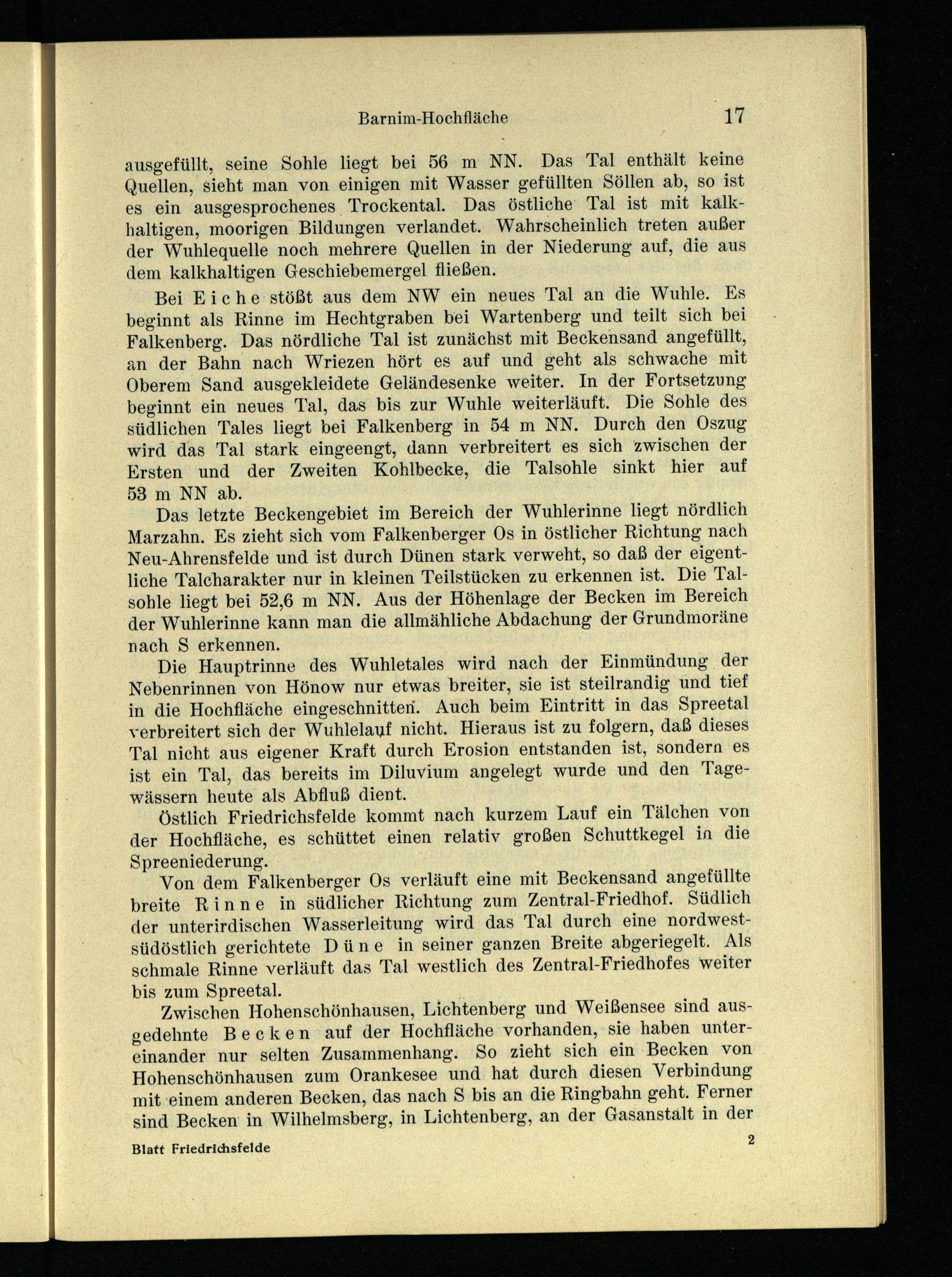 ausgefüllt, seine Sohle liegt bei 56 m NN. Das Tal enthält keine Quellen, sieht man von einigen mit Wasser gefüllten Söllen ab, so ist es ein ausgesprochenes Trockental. Das östliche‘ Tal ist mit käalkhaltigen, moorigen Bildungen verlandet. Wahrscheinlich treten außer der Wuhlequelle noch mehrere Quellen in der Niederung auf, die aus dem kalkhaltigen Geschiebemergel fließen.