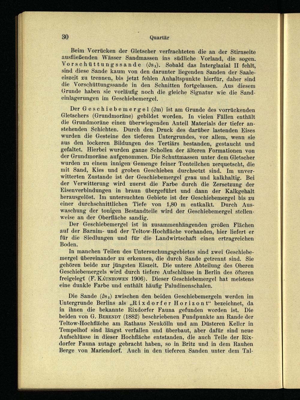 Die Sande(ösı) zwischen den beiden Geschiebemergeln werden im Untergrunde Berlins als„Rixdorfer Horizont“ bezeichnet, da in ihnen die bekannte Rixdorfer Fauna gefunden worden ist. Die beiden von G. BERENDT(1882) beschriebenen Fundpunkte am Rande der Teltow-Hochfläche am Rathaus Neukölln und am Düsteren Keller in Tempelhof sind längst verfallen und überbaut, aber dafür sind neue Aufschlüsse in dieser Hochfläche entstanden, die auch Teile der Rixdorfer Fauna zutage gebracht haben, so in Britz und in dem Rauhen Berge von Mariendorf. Auch in den tieferen Sanden unter dem Tal